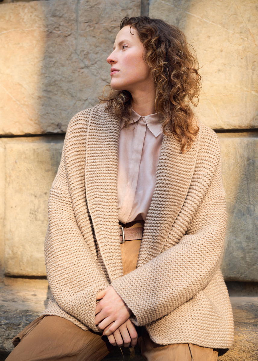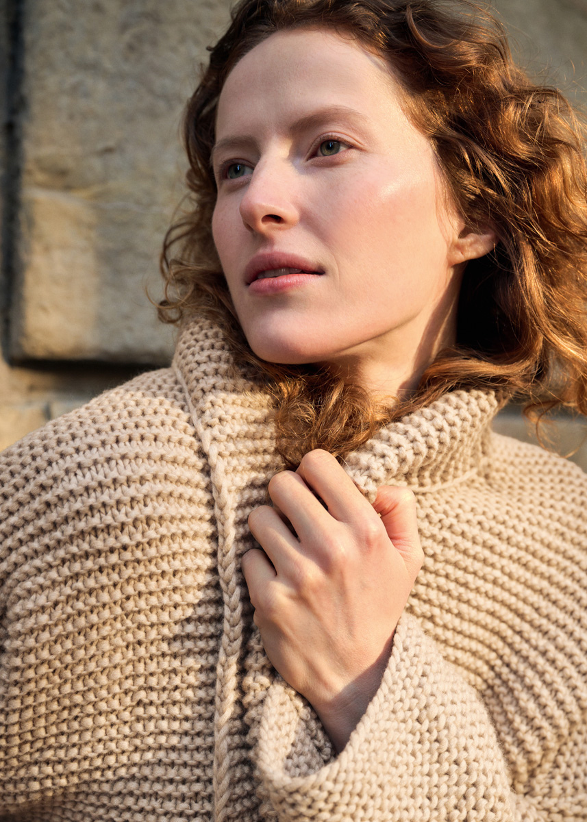 Garn: Lana Grossa «Winter Softness» (62 % ren ull (merino extrafine), 38 % bomull (bio), LL = ca. 70 m/50 g): Ca. 900 (950 - 1000 - 1050) g beige (frg 18).