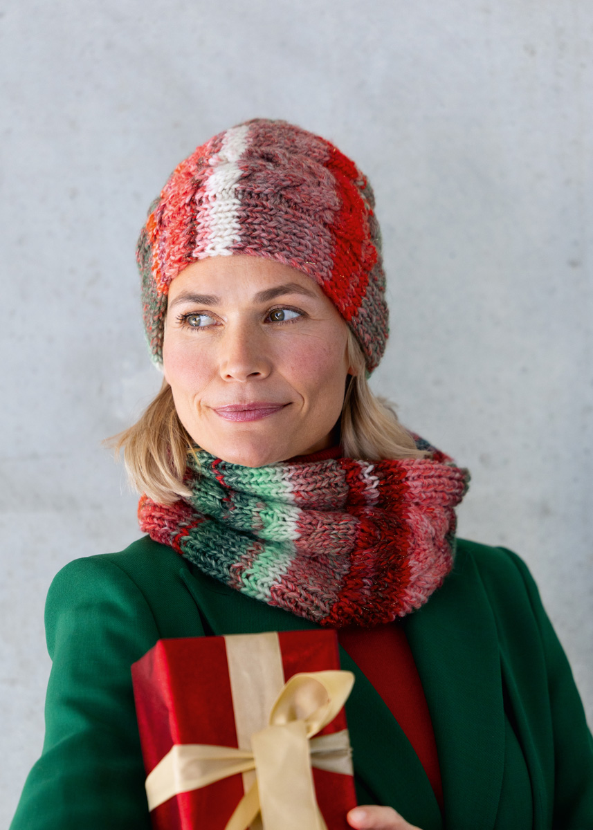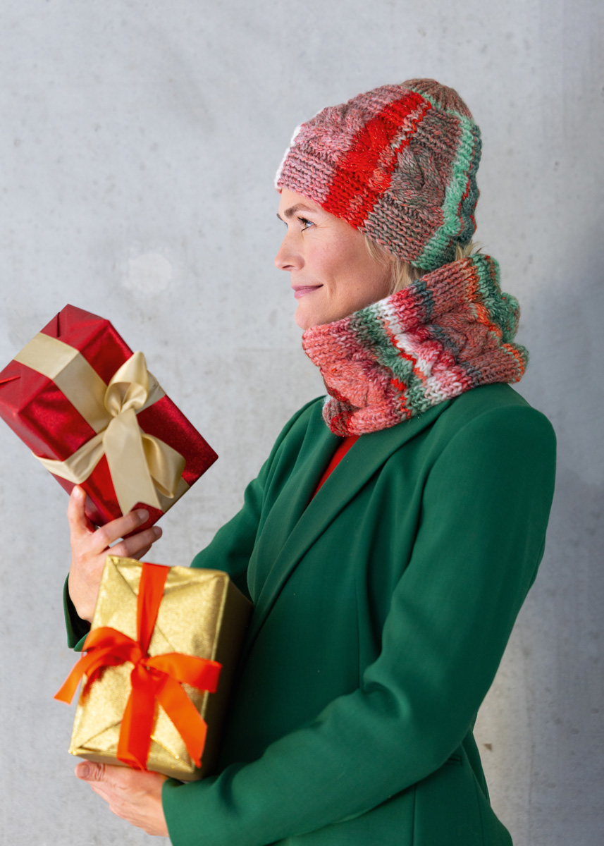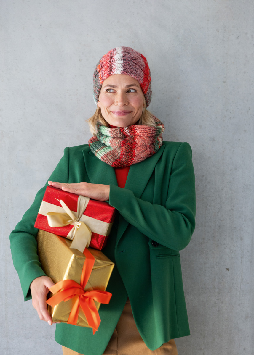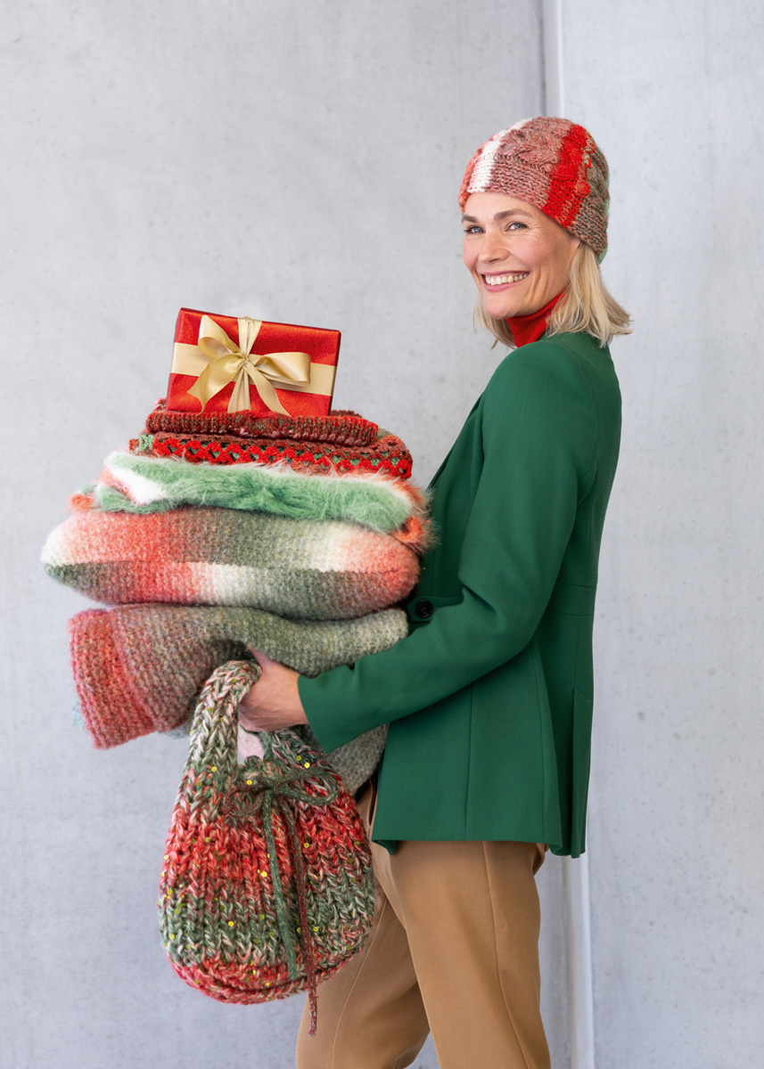 Lana Grossa-kvalitet Christmas Edition Big Lurex (60% ren ny ull, 40% polyacryl, løpelengde = ca 180 m/100 g): 100 g grårød/rød/ecru/Svartrød/hvitrød/orange/mørk grønn/hvitgrønn/mørk grå/mørk rød verschieden stripet (farge 203); Strikkepinner nr. 6; 1 settpinner nr. 6; 1 flettepinne.