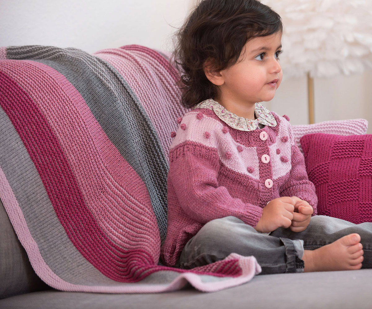 Lana Grossa Cool Wool Big melange (100 % Schurwolle, Lauflänge 120 m/50 g) 150 g Rosa meliert (Fb 334) und 100 g Altrosa meliert (Fb 330) und Cool Wool Big (100 % Schurwolle, Lauflänge 120 m/50 g) 100 g Bordeaux (Fb 954 ), 100 g Hellgrau meliert (Fb 616) und 100 g Dunkelgrau meliert (Fb 617); eine 80 cm lange Rundstricknadel Nr. 4,5 und zwei 120 cm lange Rundstricknadeln Nr. 4,5