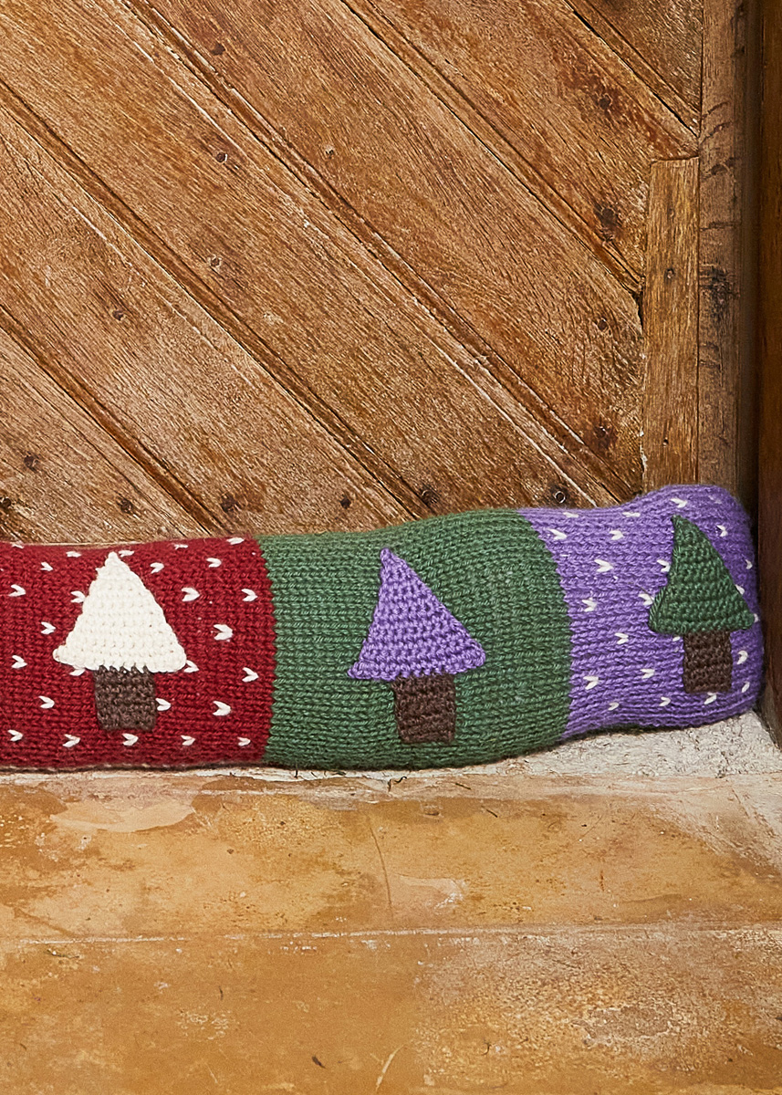 Lana Grossa-kvalitet „Land-lust Alpaka merino 100“ (50% baby alpacka, 50% ren ny ull merino filtfri, löplängd ca. 100 m/50 g), 50 g var i råvit (färg 301), bordeaux (färg 320), violett (färg 316), grön (färg 324), taupe (färg 304) och gråbrun (färg 305); stickor nr. 4,5, 1 virknål nr. 3,5, 150 g Prym vaddfyllning, 1 m svart Prym gummiband, 25 mm brett.