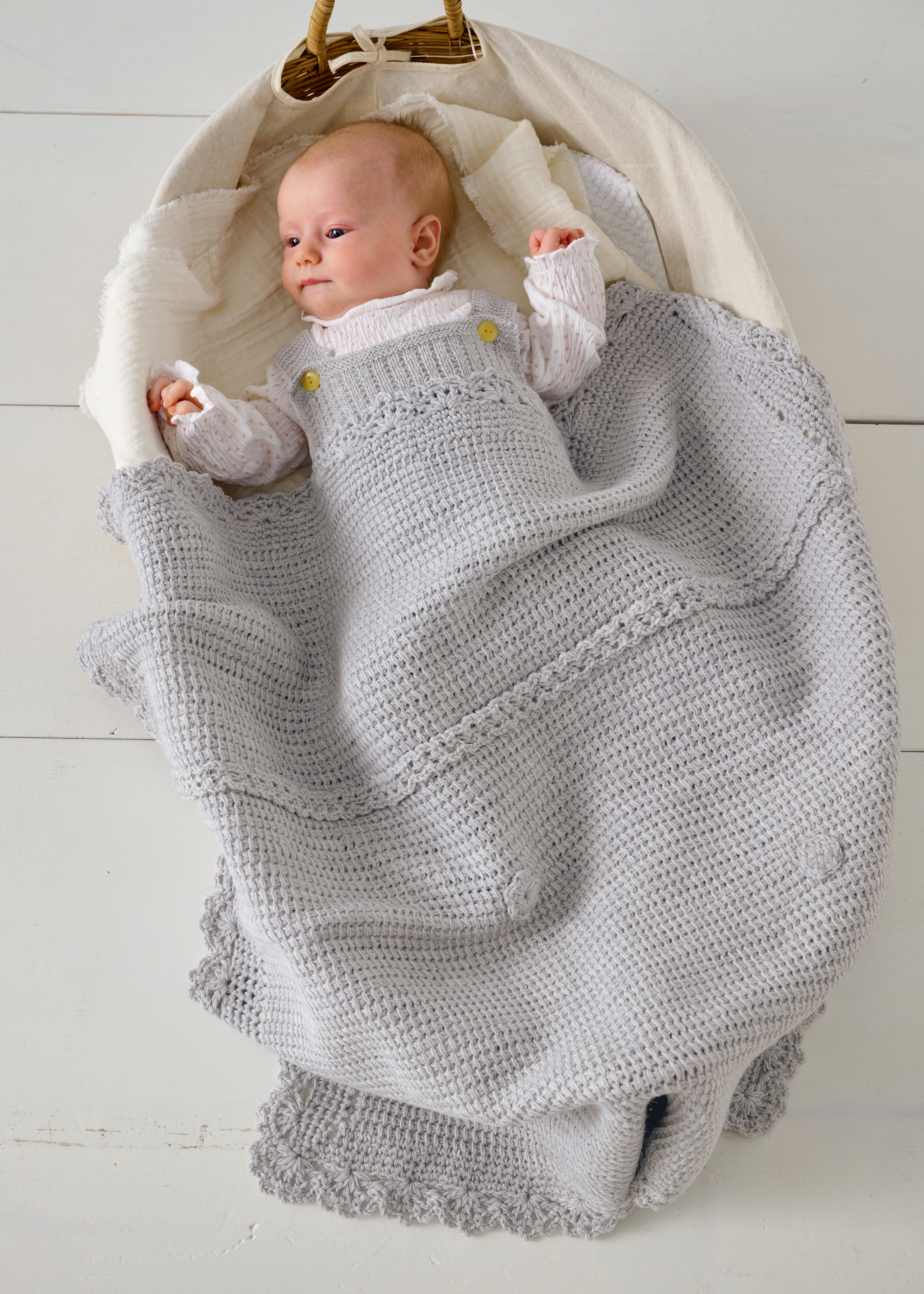 Lana Grossa Cool Wool Baby (100% ren ny ull (merino extrafine); løpelengde = 220 m/50 g): 300 g lysgrå melert (farge 206); 1 tunisisk heklenål nr. 4.