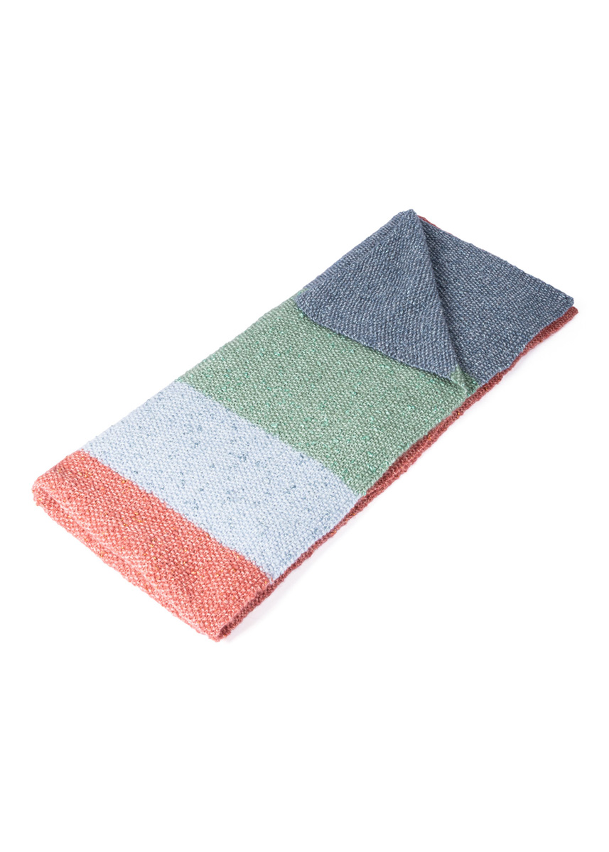 Lana Grossa-kvalitet „Lucciola” (29 % polyamid, 24 % ren ny ull (merino Fine), 22 % viskose, 20 % (baby) alpakka, 5 % metalliske fibre, løpelengde = ca. 130 m/50 g): ca. 500 g terrakotta (farge 9), hver ca. 150 g grønn (farge 3) og lysblå (farge 5) og ca. 100 g gråblå (farge 4); 1 rundpinne nr. 5, 120 cm lang.