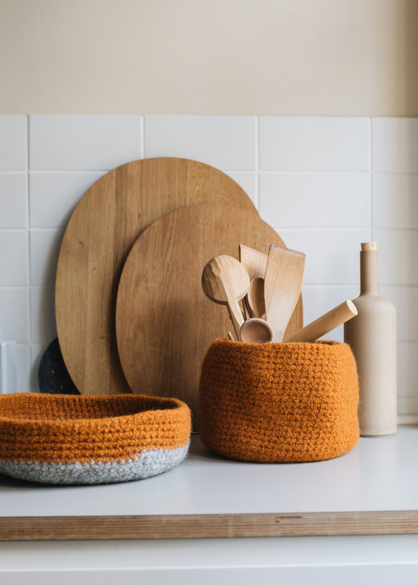 Lana Grossa-kvalitet „Feltro“ (100 % ren ny ull, löplängd = ca 50 m/50 g): ca 200 g bärnsten (färg 92); virknål nr. 8. 1 maskmarkör.