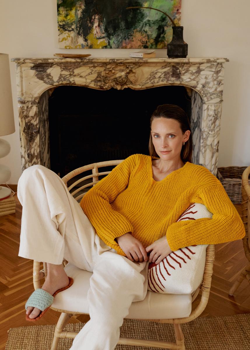 Lana Grossa-kvalitet „Feltro” (100 % ren ny ull, löplängd = ca. 50 m/50 g): ca. 100 g rost (färg 105) och ca. 50 g gröngrå (färg 110); stickor nr. 15.