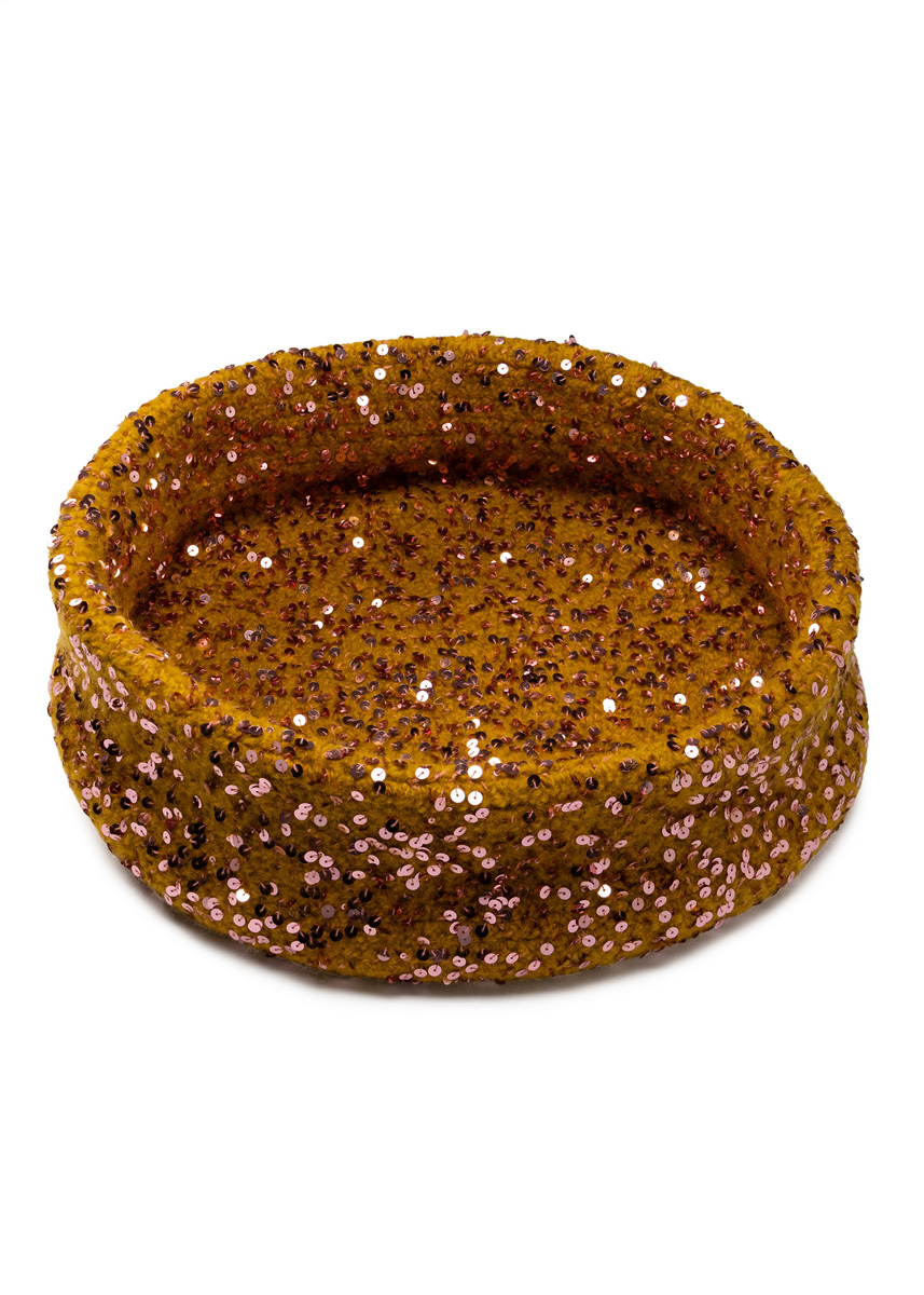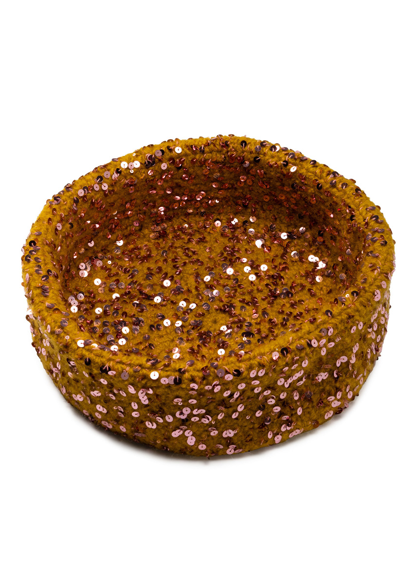 Lana Grossa-kvalitet „Feltro” (100 % ren ny ull, løpelengde = ca. 50 m/50 g): stor skål: ca. 700 g sennep (farge 125) og liten skål: ca. 400 g sennep (farge 125) og Lana Grossa-kvalitet „Cosmo” (100 % bomull (plus Pailletten), løpelengde = ca. 260 m/100 g): stor og liten skål: hver ca. 100 g gammeltrosa (farge 14); 1 heklenål nr. 7. Merknad: Alt hekles med dobbel tråd, med én tråd av hver kvalitet sammen.!