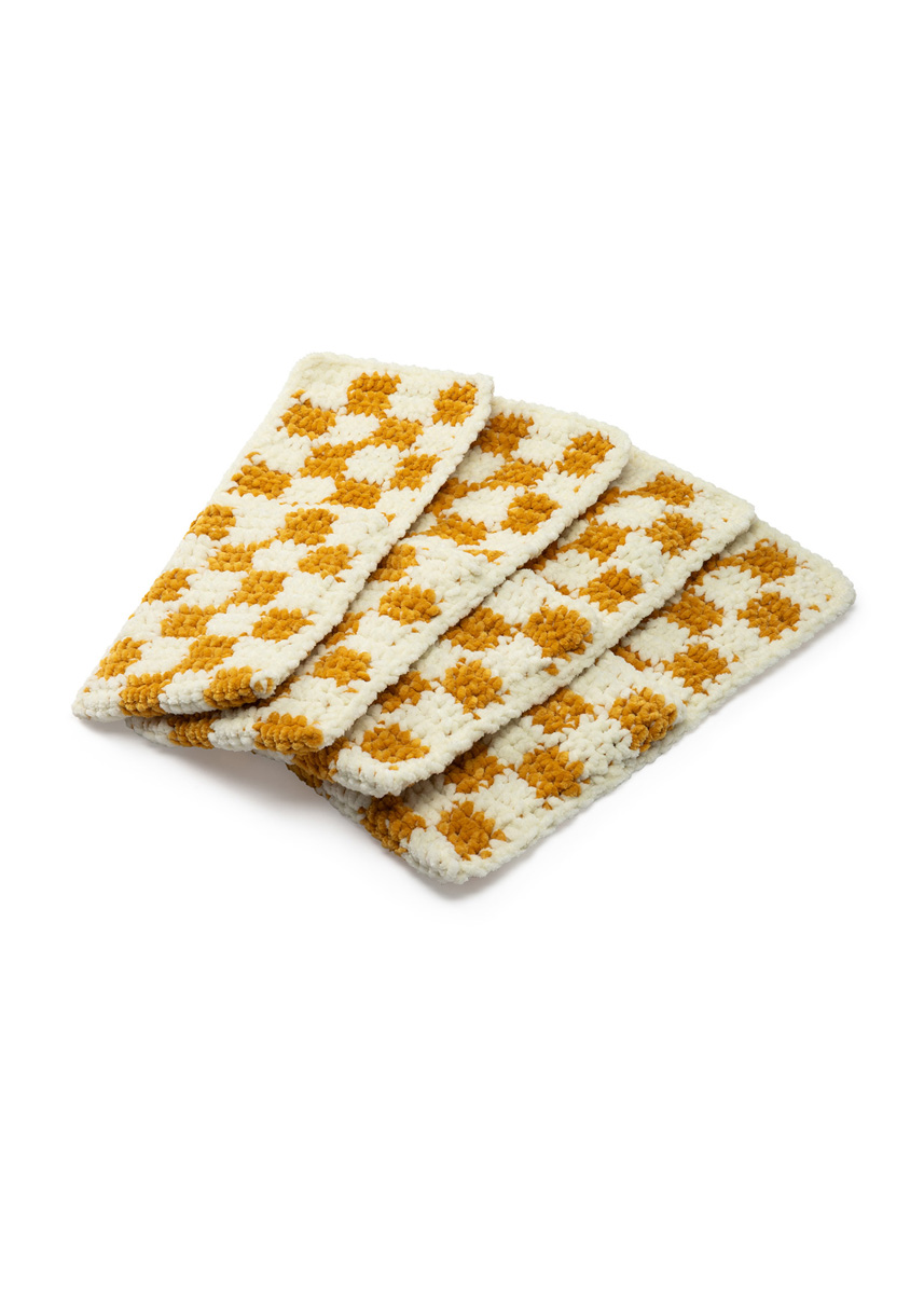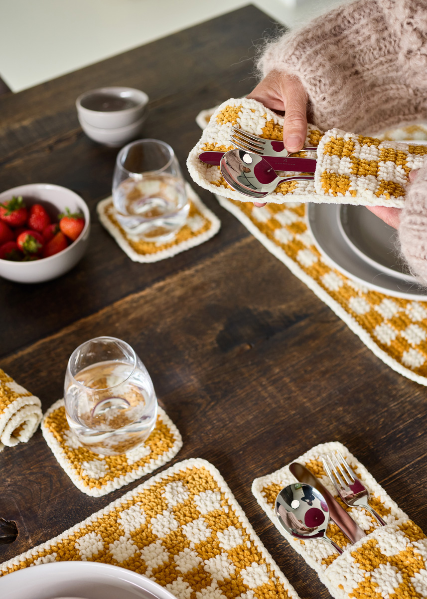 Lana Grossa-kvalitet „The Look Fine” (100 % polyester, løpelengde = ca. 100 m/50 g): hver ca. 50 g creme (farge 102) og rapsgul (farge 128); 1 heklenål nr. 4,5.