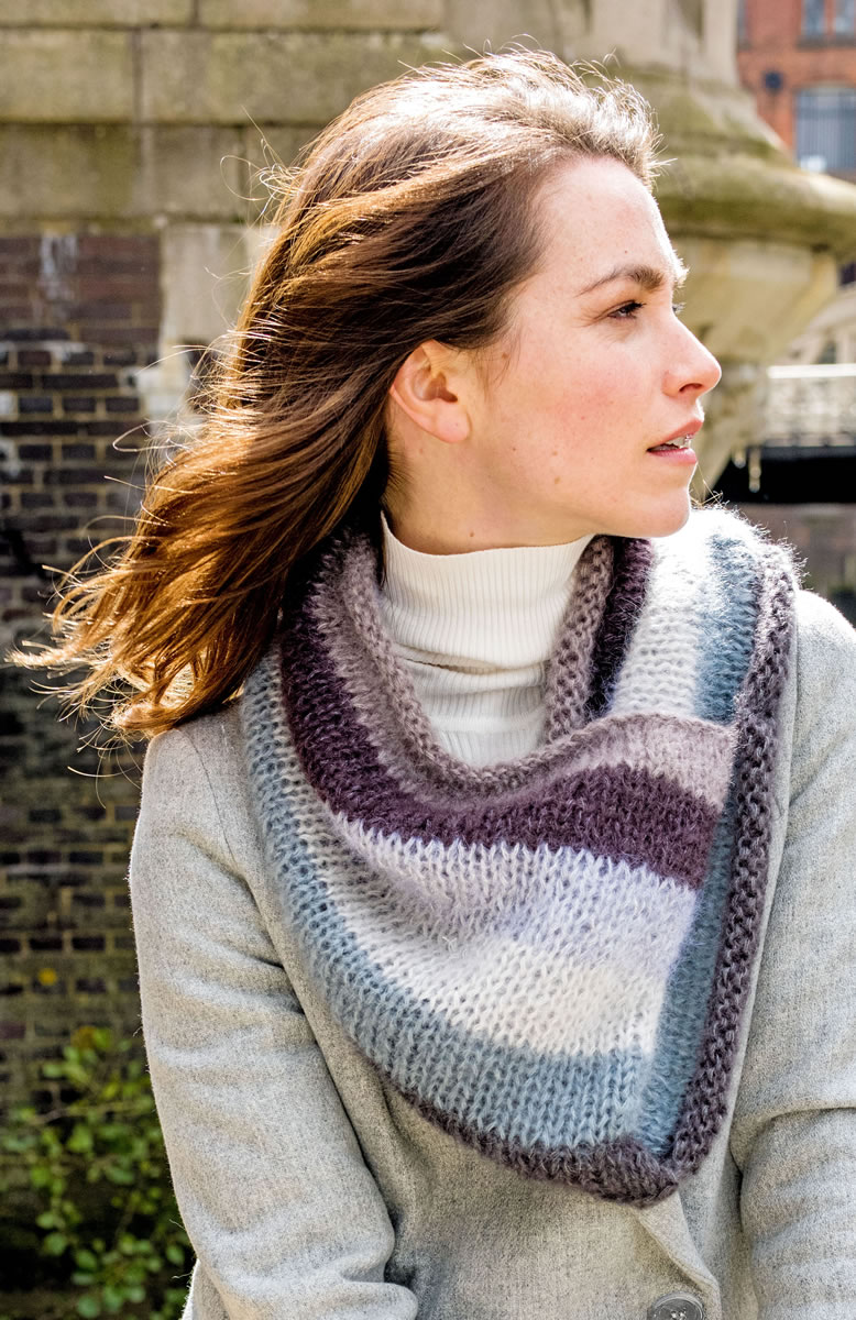 Lana Grossa-Qualität „Silkhair“ (70 % Mohair Superkid, 30 % Seide, LL = ca. 210 m/25 g), 25 g Taupe (Fb 35), 25 g Marone (Fb 78), 25 g Blasslila (Fb 59), 25 g Silbergrau (Fb 41), 25 g Graphitgrau (Fb 94) und 25 g Schiefer (Fb 84). 1 lange Rundstrick-Nd Nr 10.