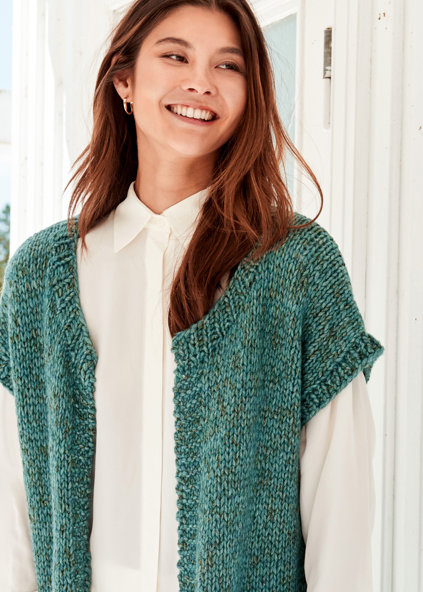 Lana Grossa-kvalitet „Lala Berlin Lovely Cotton” (75 % ren ny ull (merino superfine), 25 % bomull, løpelengde = ca. 90 m/50 g): ca. 500 (550) g petrol (farge 18) og Lana Grossa-kvalitet „Brillino” (83 % viskose, 17 % metallfiber, løpelengde = ca. 200 m/25 g): ca. 100 (125) g svartbrun/sølv (farge 18); rundpinner nr. 8 og 10, 120 cm lang, 1 rundpinne nr. 8, 60 cm lang.