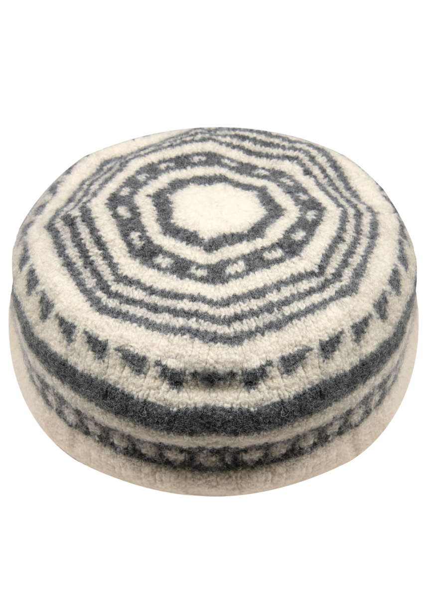 Material: Lana Grossa „Feltro“ (100% ren ny ull; løpelengde ca. 50 m/50 g), 500 g råhvit (farge 01) og 300 g mørk grå melert (farge 04); rundpinner nr. 9 i 40 og 60 cm lengde, settpinner nr. 9; 1 fjærpute 80 x 80 cm eller gamle puter til fylling.