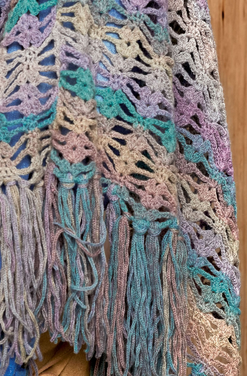 Lana Grossa-Qualität „Cashmere 16 Fine Degradè“ (80 % Schurwolle Merino extrafine, 10 % Kaschmir, 10 % Polyamid, LL = ca. 320 m/50 g), 200 (250) g Lila/Schilf/Türkis (Fb 101). 1 Häkel-Nd Nr 4.