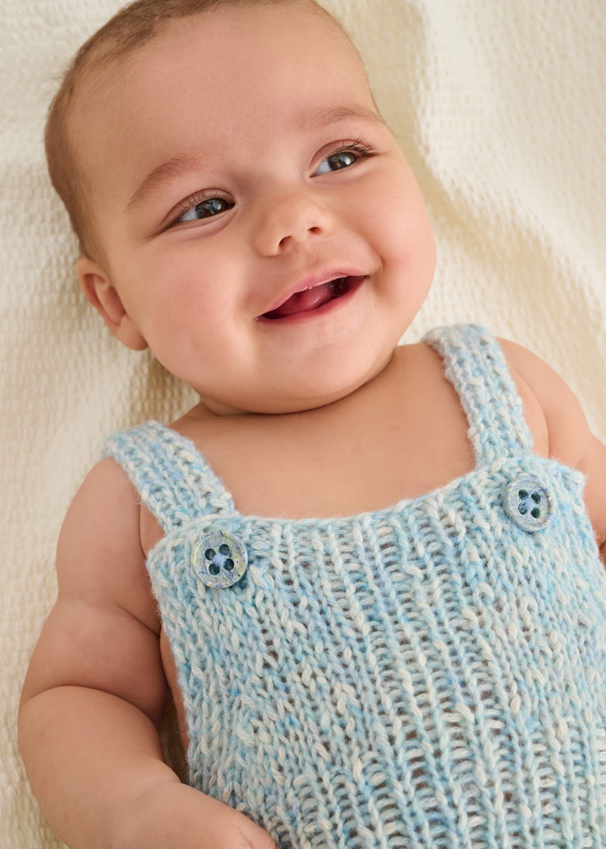 Lana Grossa Bottoni (53% bomull, 24% viskose, 23% ren ny ull (merino extrafine); løpelengde = 125 m/50 g): 100 (100/150) g pastelltyrkis/råhvit (farge 6); eine rundpinne 4,5 mm; 2 Maschenhalter eller Sicherheitsnadeln; 2 knapper med 18 mm Ø.