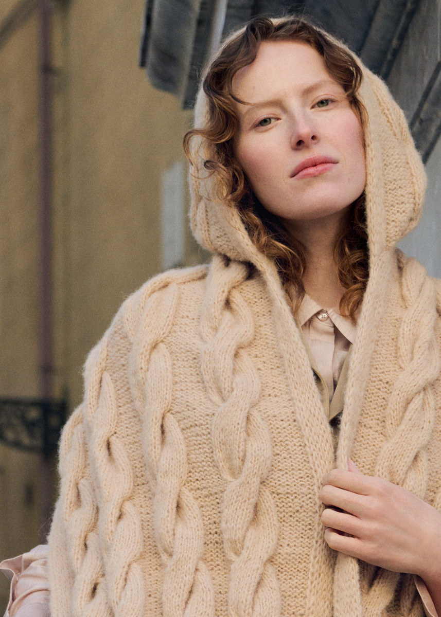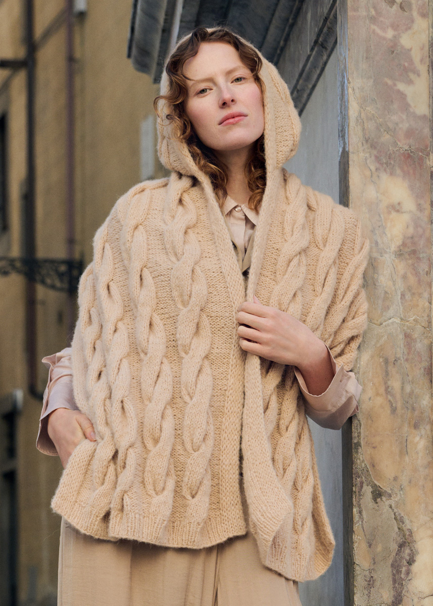 Garn: Lana Grossa «Nebbia» (55 % ren ull (merino extrafine), 45 % alpakka (baby), LL = ca. 170 m/50 g): 400 g beige (frg 13).