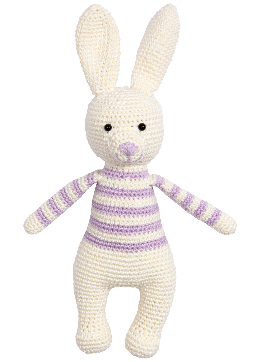 Lana Grossa-kvalitet ”Cotone” (100 % bomuld), løbelængde = ca. 125 m / 50 gr.): 50 gr råhvid (fv 28) og 50 gr syren (fv 7), hæklenål nr. 3, 2 halvperler, 5 mm Ø, fyldvat.