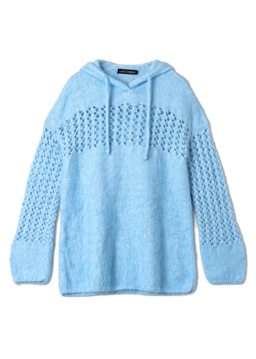 Lana Grossa Finito (73% bomull, 27% polyamid, løpelengde = ca 150 m/50 g), 550 (600 - 650 - 700) g i lysblå/creme (farge 21). strikkepinner nr. 3,5 og nr. 4. 1 strikkelise, 2 maskemarkører [MM[, 2 hjelpepinner til hvilende m.