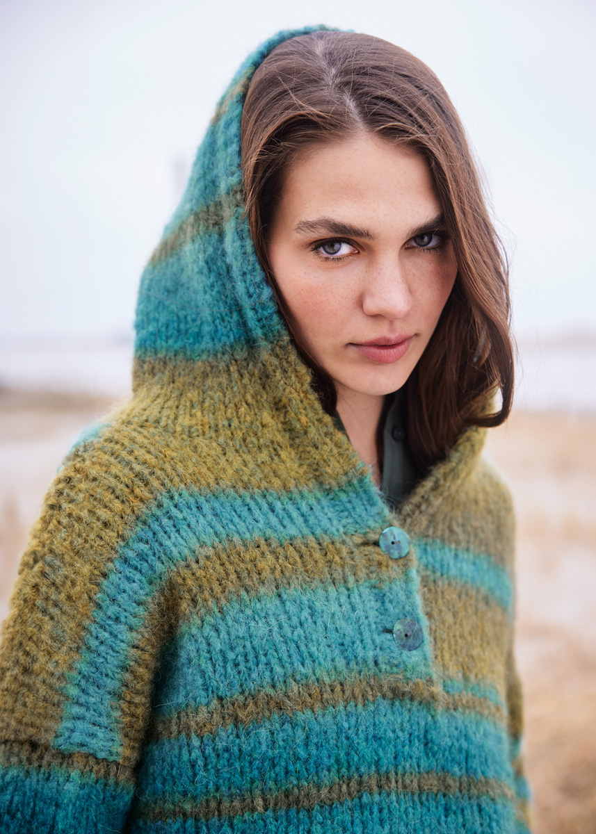 Lana Grossa-kvalitet ”Gigante” (70 % alpaka (fine), 30 % polyamid, løbelængde = ca. 300 m / 100 gr): ca. 300 (300 – 400 – 400 – 500) gr petrol/søgrøn/oliven/ lyseoliven (fv 8), strikkepinde nr. 5½ og 6, en kort rundpind nr. 5½, 2 knapper i passende farve, Ø ca. 23 mm.