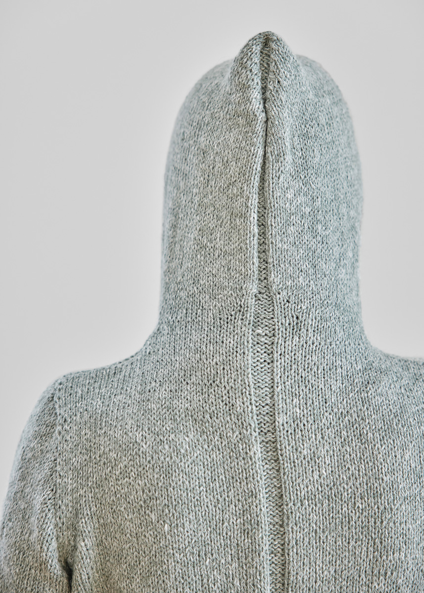 Lana Grossa-kvalitet ”Cara” (57 % (baby) alpaka, 33 % bomuld, 10 % ren ny uld (merino), løbelængde = ca. 120 m / 50 gr.): ca. 550(600-650) gr grågrøn (fv 12), strikkepinde nr. 4½, 4 perlemorsknapper fra UNION KNOPF, art. 37604, fv 12, 18 mm Ø.