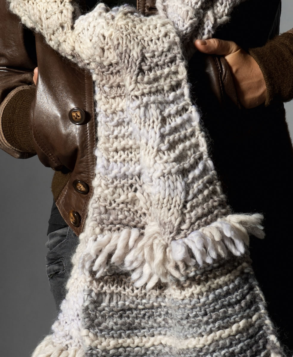 Lana Grossa-kvalitet ”Olympia” (53 % ren ny uld, 47 % polyakryl, løbelængde = 100 m / 100 gr.): ca. 300 gr. natur/beige (fv. 413) og ”Olympia Color” (53 % ren ny uld, 47 % polyakryl, løbelængde = 100 m / 100 gr.): ca. 300 gr. natur/grège/grå/beige/camel (fv. 26), strikkepinde nr. 10, hæklenål nr. 8.