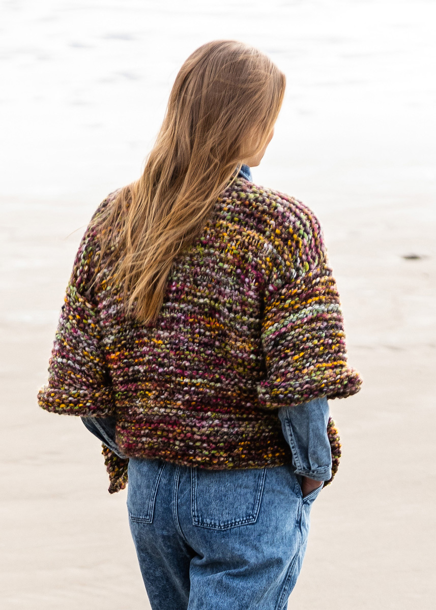 Lana Grossa-kvalitet „Allegra” (52 % ren ny ull, 48 % polyacryl, löplängd = ca. 50 m/100 g): ca. 900 (1000) g gul/björnbär/cyklamen/ljus grön/natur (färg 6); stickor nr. 12 och 15.