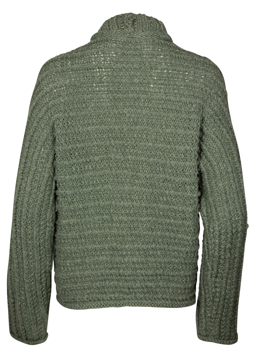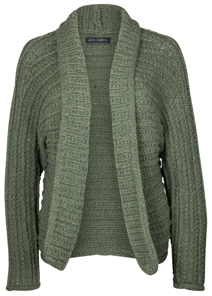 Lana Grossa Alta moda Cashmere 16 (78% ren ny ull merino, 12% kashmir, 10% polyamid, løpelengde 110 m/50 g), 500 (550 – 600) g grågrønn (farge 45); strikkepinner nr. 7 og 8, 1 rundpinne nr. 8, 80 cm lang.