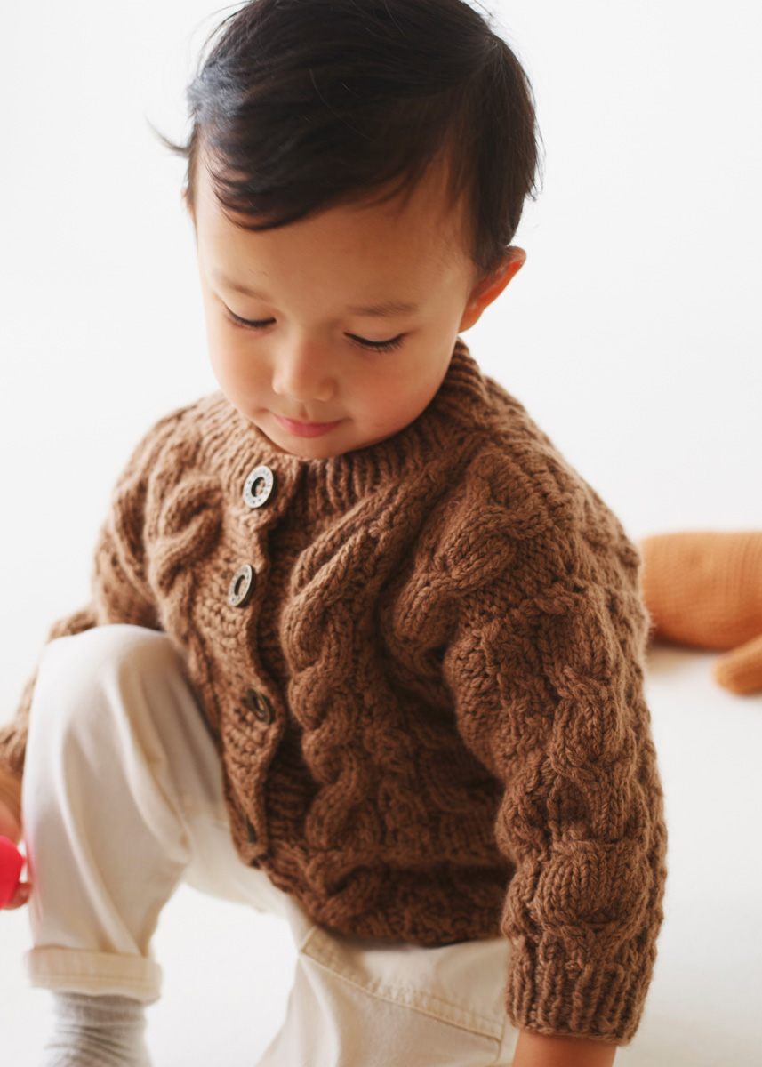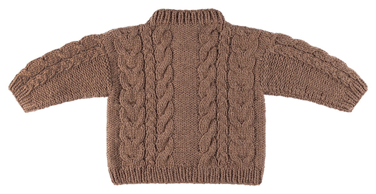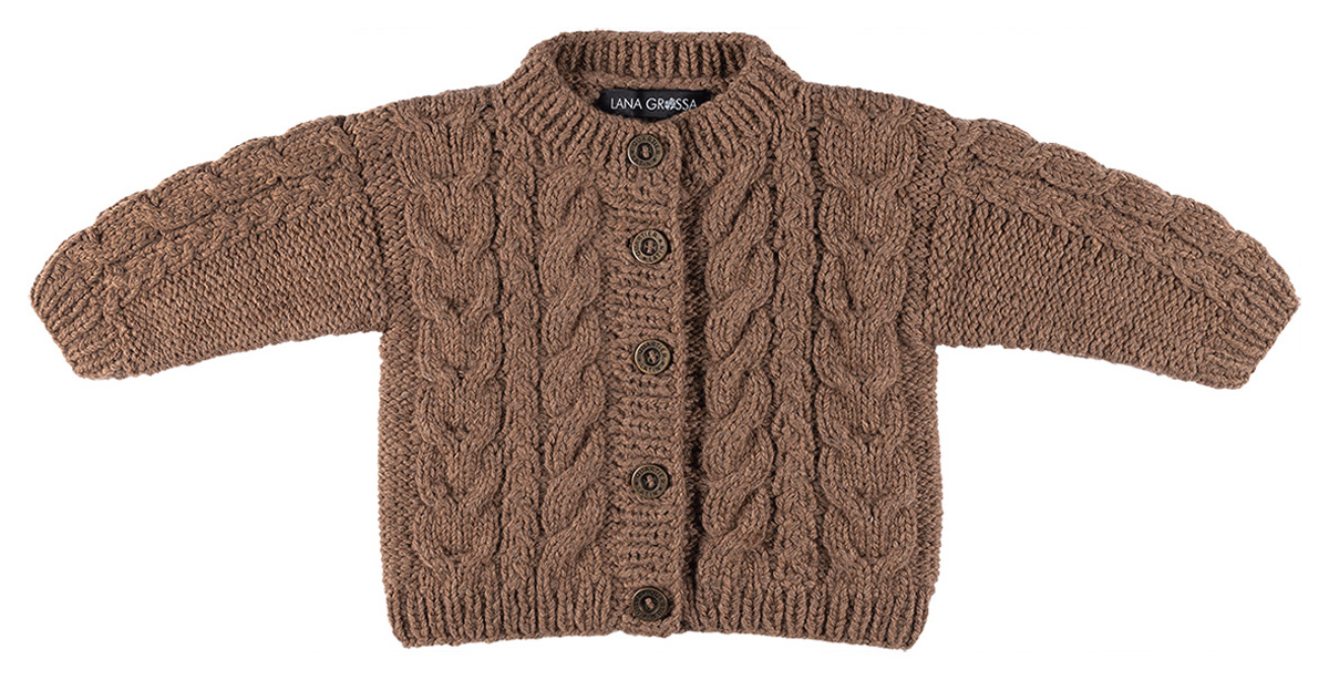 Lana Grossa Alta Moda Cashmere 16 (78% ren ny ull (merino), 12% kashmir, 10% polyamid, löplängd 110 m/50 g), 200 (250 – 300) g ljus brun (färg 48); rundstickor nr. 6 och 8, 60 cm lång, 1 flätsticka, 5 knappar från UNION KNOPF, Art. 23108, färg 851, storlek 20 mm.