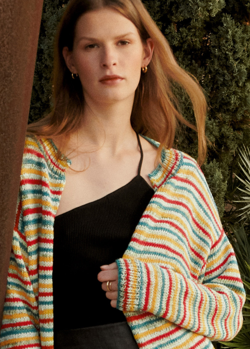 Lana Grossa-kvalitet „Alta Moda Cotolana” (45 % ren ny ull (merino), 45% bomull (Pima), 10 % polyamid, löplängd = ca. 150 m/50 g): ca. 100 g var i gul (färg 1), röd (färg 34) och petrol (färg 13) och „Ecco” (65 % bomull, 23% silke, 12 % viskos, löplängd = ca. 120 m/50 g): ca. 300 (350 - 400) g mjuk grön/ljus grön/gulgrön/mossgrön/ljus orange (färg 103); stickor nr. 4,5, 1 rundsticka nr. 4,5, 50 cm lång.