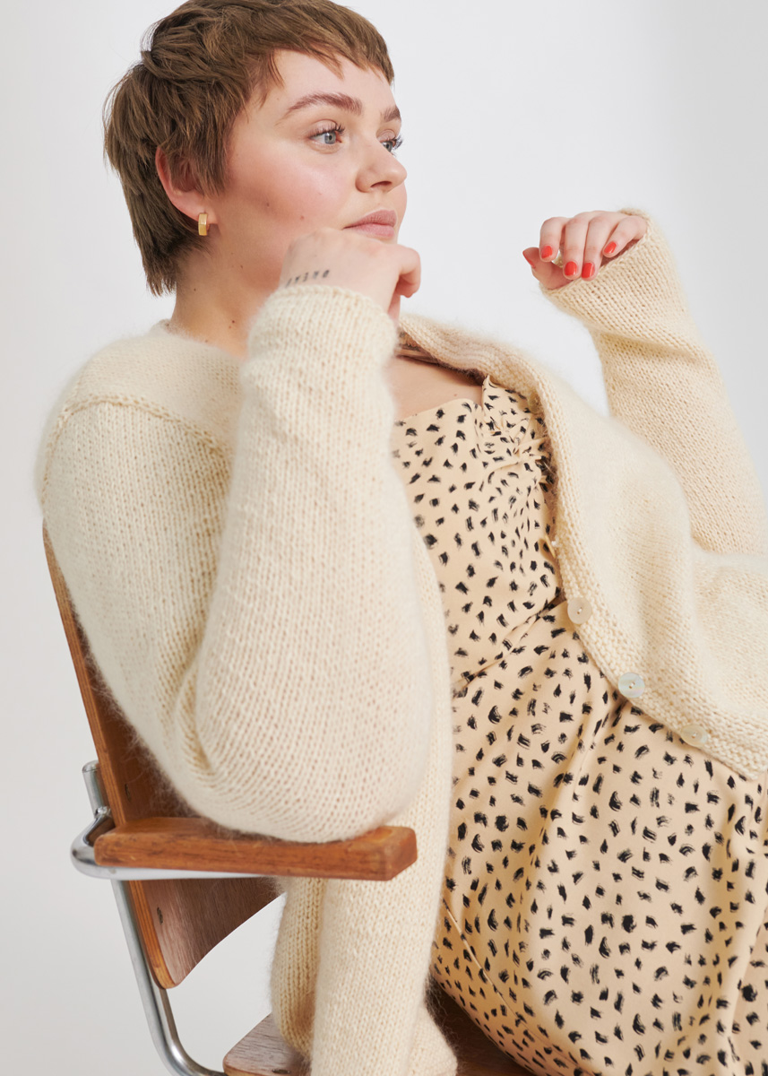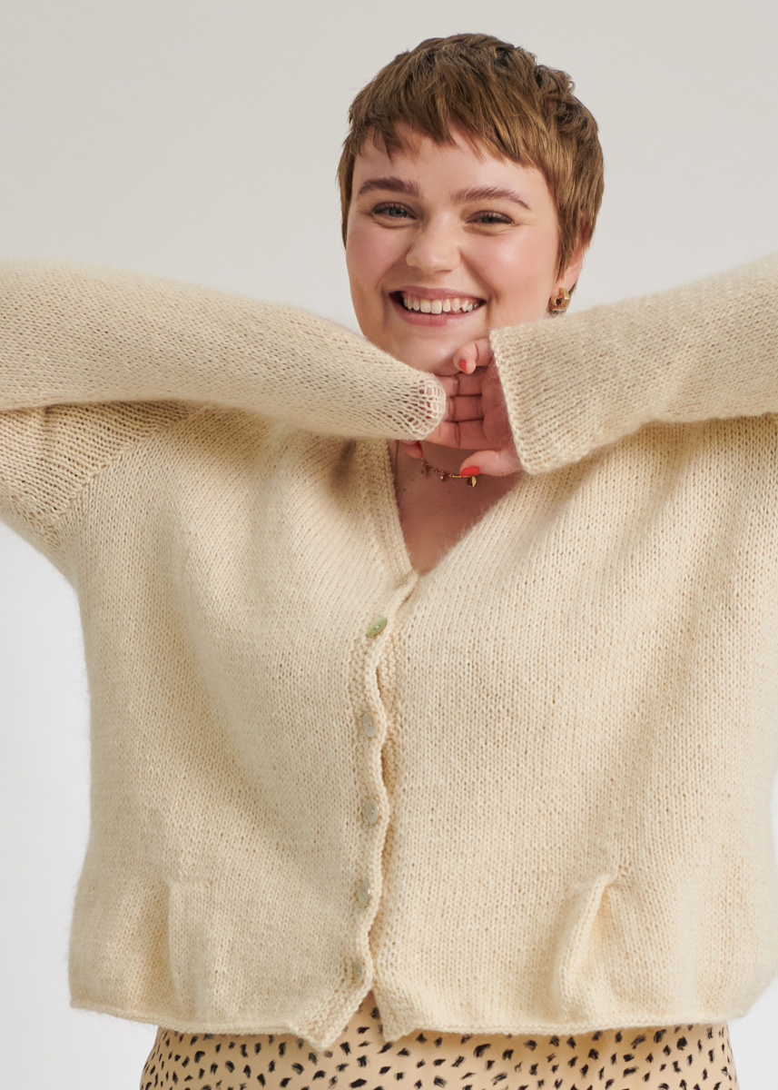 Lana Grossa-kvalitet „Alta Moda Cotolana“ (45 % ren ny ull (merino), ren ny ull (merino) 45 % (Pima) bomull, 10 % polyamid, löplängd 150 m/50 g): ca. 400 (450 – 500) g Ecru (färg 20) och Lana Grossa-kvalitet „Silkhair“ (70 % mohair (superkid), 30 % silke, löplängd 210 m/25 g): ca. 150 (150 – 175) g råvit (färg 52); stickor nr. 5, 1 rundsticka nr. 5, 100 cm lång, 1 hjälpsticka; 6 pärlemorknappar från Union Knopf, Art. 37604, färg 12 natur, ø 18 mm