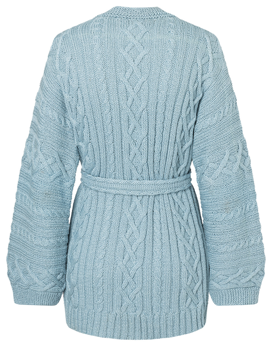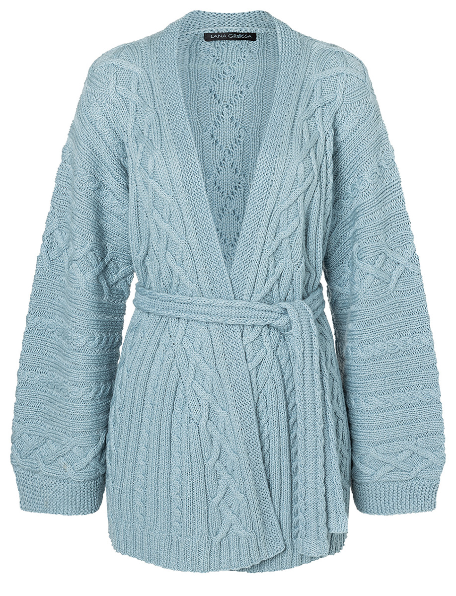 Lana Grossa Alta Moda Cotolana (45% ren ny ull (merino), 45% Pima bomull, 10% polyamid, löplängd 150 m/50 g), 750 (800 – 850) g isblå (färg 11); rundstickor nr. 4,5 och 5, 120 cm lång, 1 virknål nr. 4, 1 hjälpsticka/flätsticka.