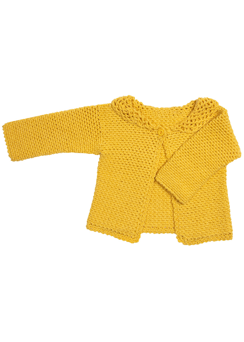 Lana Grossa-kvalitet ”Alta Moda Cotolana” (45 % ren ny uld (merino), 45 % (pima) bomuld, 10 % polyamid, løbelængde = ca. 150 m / 50 gr.): ca. 150(150-200) gr gul (fv 1), hæklenål nr. 3½, 1 knap, 15 mm Ø.