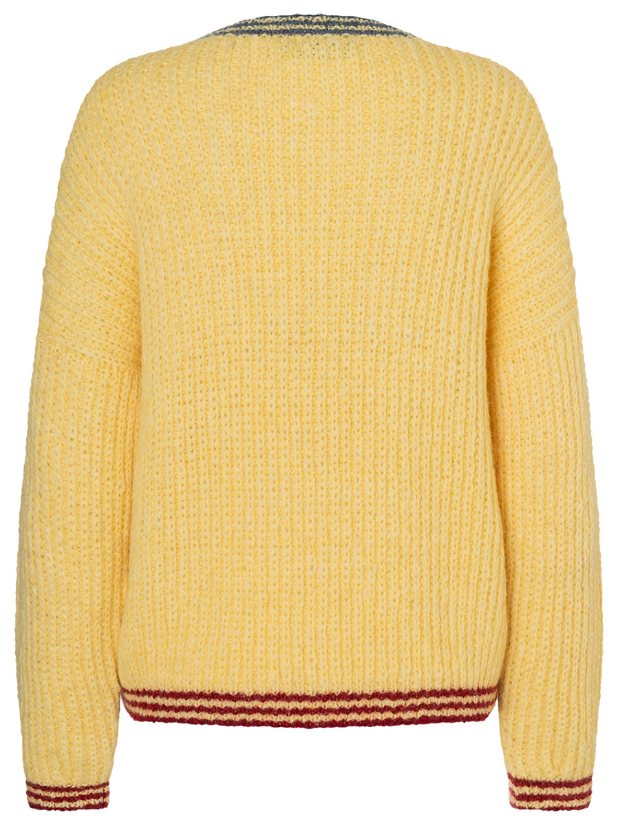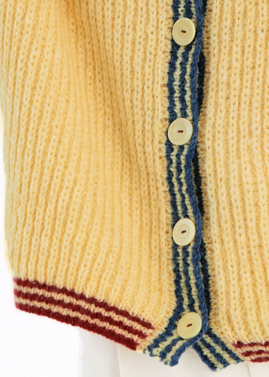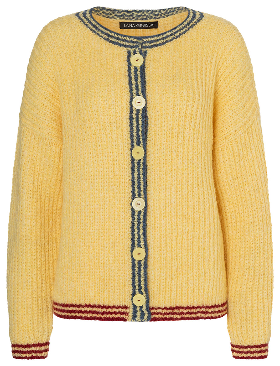 Lana Grossa-kvalitet „Baby Light” (62 % (baby) alpacka, 23 % ren ny ull (merino), 15 % polyamid, löplängd = ca. 180 m/50 g): ca. 350 (400 – 450) g mjuk gul (färg 18) och ca. 50 g var i bordeaux (färg 3) och jeans (färg 7); stickor nr. 4 och 5, 1 rundsticka nr. 4, 80 cm lång; 6 passande knappar i gul, ø 25 mm.