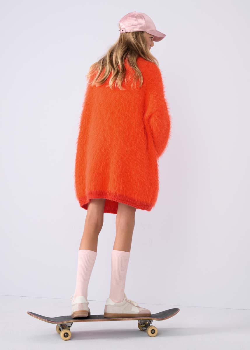 Lana Grossa-kvalitet „Basta“ (50% ren ny ull (merino), 50% polyamid, löplängd = ca 100 m/50 g): ca 500 (550 - 550 - 600) g orange (färg 11) och Lana Grossa-kvalitet „Brigitte No. 2“ (47% alpacka (baby), 45% bomull, 8% ren ny ull (merino), löplängd = ca 140 m/50 g): ca 50 (50 - 100 - 100) g korall (färg 25); stickor nr. 5 och 6; kort rundsticka nr. 6; 5 knappar i passande färg, diameter ca 25 mm.