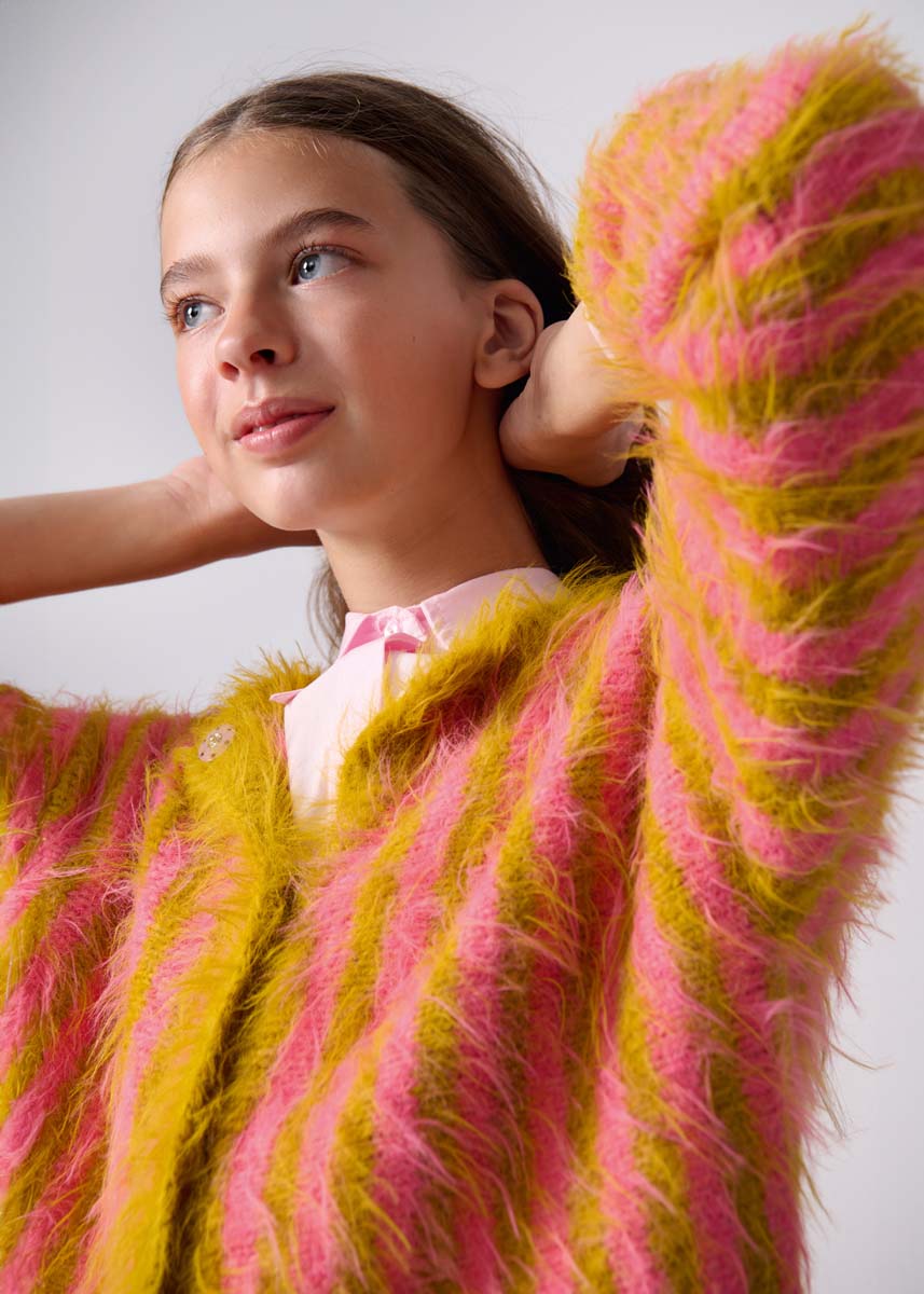 Lana Grossa-kvalitet „Basta“ (50% ren ny ull (merino), 50% polyamid, löplängd = ca 100 m/50 g): ca 150 (200 - 200 - 200) g bonbonrosa (färg 8) och ca 200 (200 - 250 - 250) g senapsgul (färg 12); stickor nr. 4, 5 och 5, 5; kort rundsticka nr. 4, 5; 5 tryckknappar i passande färg, diameter ca 20 mm.