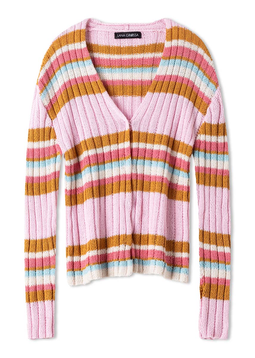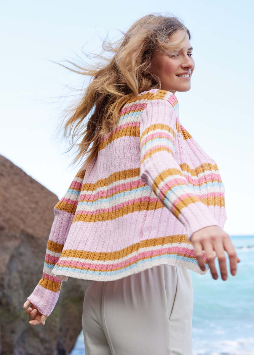 Lana Grossa „Campo“ (65% bomull, 25% viskose, 10% iin, løpelengde 165 m/50 g), 150 (200 - 200) g i rosé (farge 21), 50 (100 - 100) g i creme (farge 2), 50 (100 - 100) g i nellikerosa (farge 15), 50 (50 - 50) g i vannblå (farge 33) og 100 (100 - 150) g i gullgul (farge 29); pinner nr. 3,5 og nr. 4, 4 gjennomsiktige trykknapper for sying, 20 mm Ø.