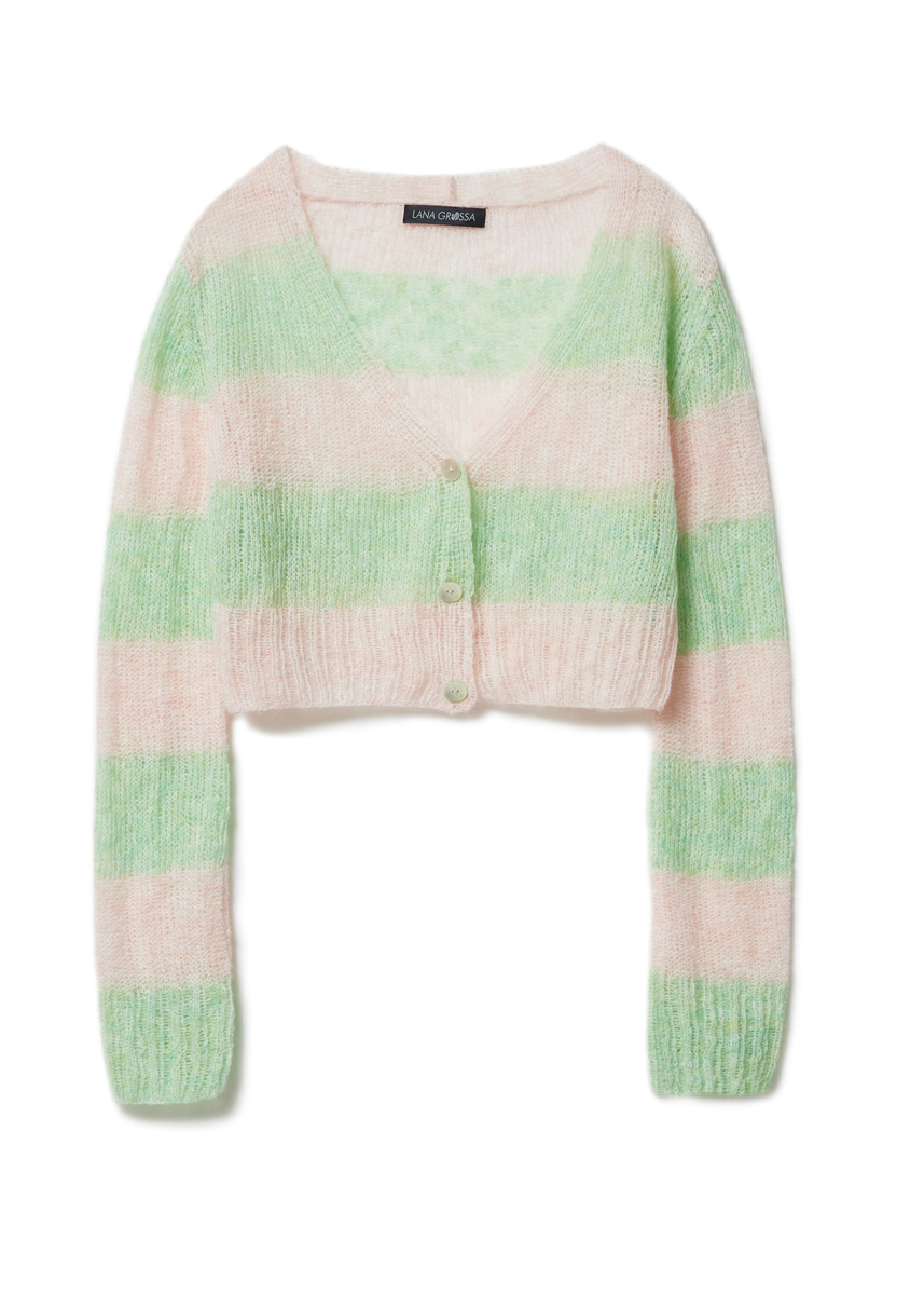 Lana Grossa „Bella“ (35 % bomull, 30 % nylon, 25 % alpacka (baby), 10 % ren ny ull (merino), löplängd 250 m/25 g), 50 g mjukrosa (färg 3) och 50 g mjukgrön (färg 20); stickor nr. 4; 3 knappar, diameter ca. 18 mm