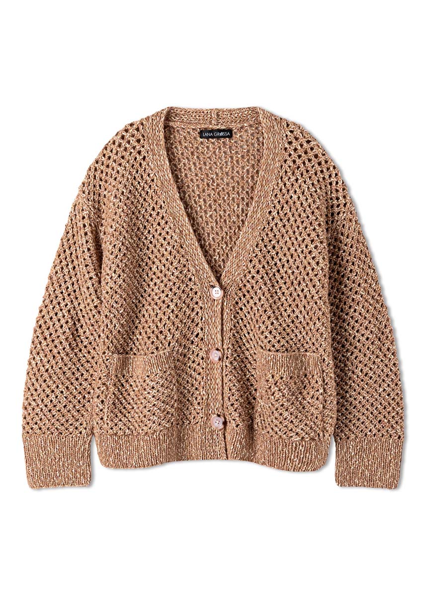 Lana Grossa-kvalitet Bottoni (53 % bomuld, 24 % viskose, 23 % ren ny uld (ekstrafin merino), løbelængde = ca. 125 m / 50 gr): Ca. 600 (650 – 700) gr camel/creme (fv 1), strikkepinde nr. 4 og 4½, 3 knapper fra Union Knopf, art. 454230, 26 mm Ø, rosa/brun fv 46.