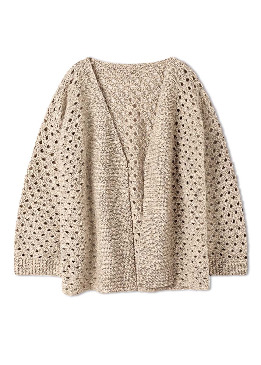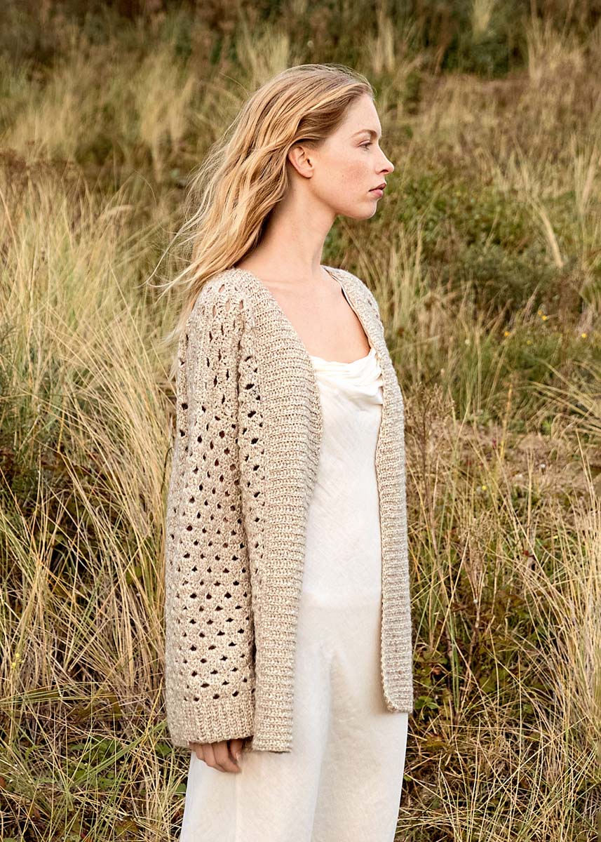 Garn: Lana Grossa «Bottoni» (53 % bomull, 24 % viskose, 23 % ren ull (merino extrafine), LL = ca. 125 m/50 g): ca. 750 (850 – 950) g gråbeige/krem (frg 13)