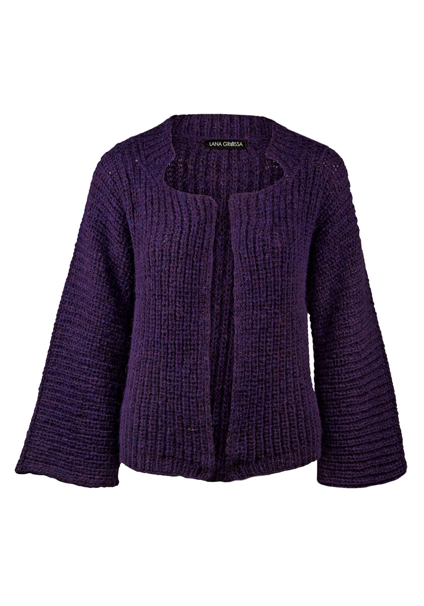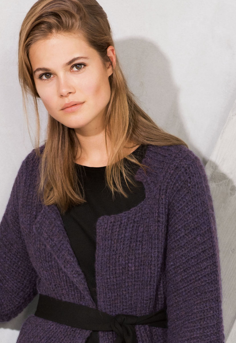 Lana Grossa-kvalitet ”Brigitte No. 2” (47 % alpaka, 45 % bomuld, 8 % ren ny uld, løbelængde = ca. 140 m / 50 gr.): ca. 400(450-500) gr aubergine (fv 7), strikkepinde nr. 4 og 5