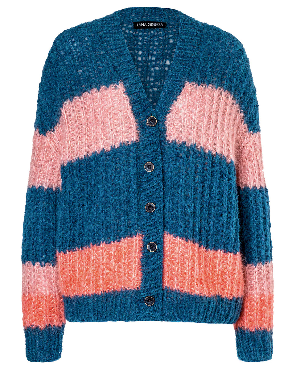 Lana Grossa-kvalitet „Nuvoletta” (42 % (baby) alpacka, 42 % ren ny ull (extrafin merino), 16 % polyamid, löplängd = ca. 250 m/50 g): ca. 250 (300) g petrolblå (färg 8) och Lana Grossa-kvalitet „Brigitte No. 3” (40 % mohair (superkid), 37 % ren ny ull, 23 % polyamid, löplängd = ca. 100 m/25 g): ca. 100 (125) g var i lax (färg 3) och puderrosa (färg 26); stickor nr. 7 och 8, 1 rundsticka nr. 7, 120 cm lång; 5 passande hornknappar, ø 21 mm. Tips: Sticka allt med dubbla trådar i samma färg!