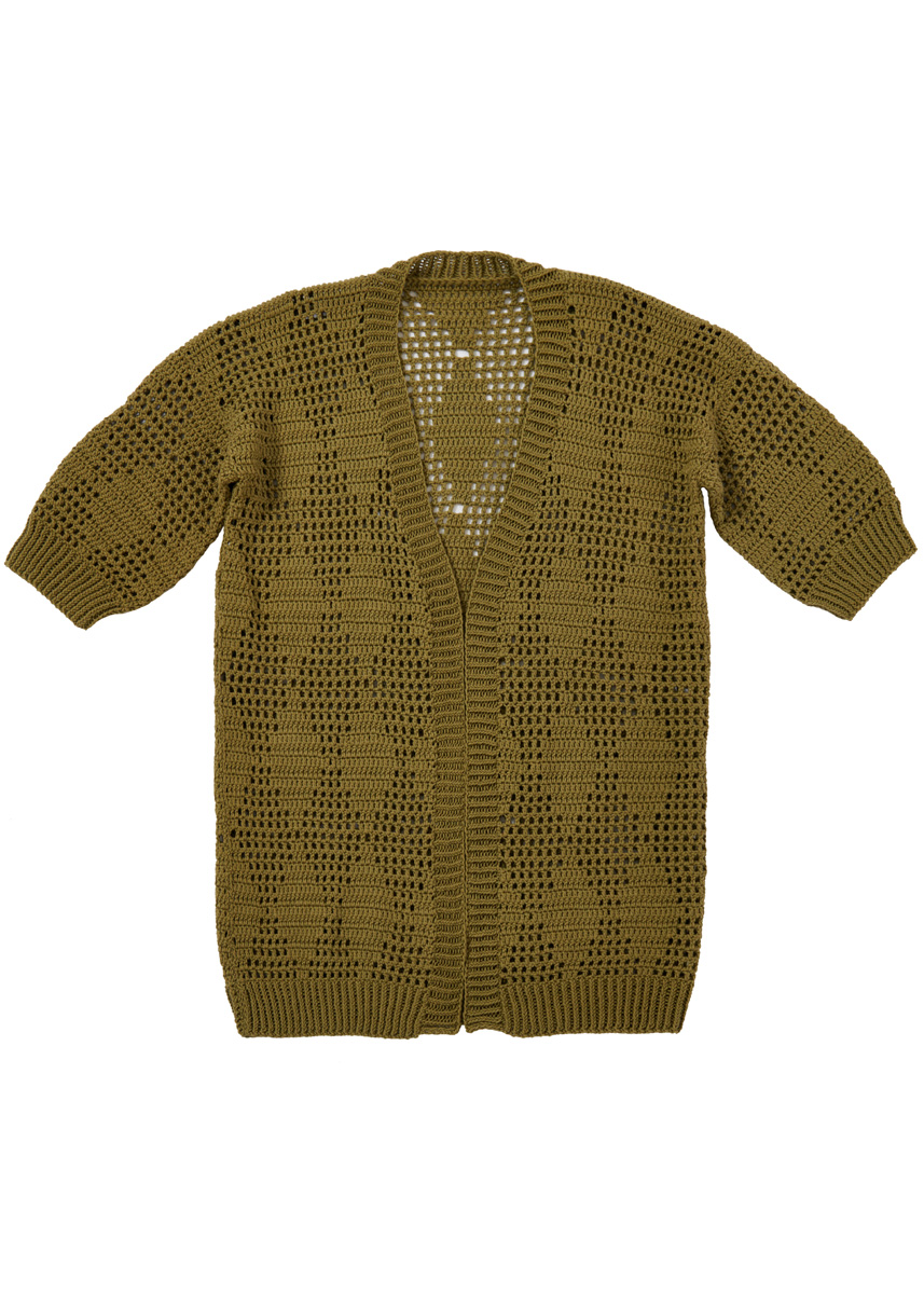 Lana Grossa-kvalitet „Brigitte No. 4“ (80 % bomull, 20 % baby alpacka, löplängd 110 m/50 g): 550 (650) g i khaki nr. 11. Stickor nr. 3,5 och virknål 4 (löst stickat och virkat) eller Stickor nr. 4 och virknål 4,5 (hårt stickat och virkat) – viktigt är att fastheten passar. 1 lång rundsticka 3,5 eller 4.