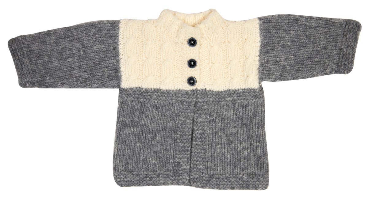 Lana Grossa-kvalitet ”Cashmere 16 Fine” (80 % ren ny merino, ekstrafin, 10 % cashmere, 10 % polyamid, løbelængde = ca. 320 m / 50 gr.): ca. 50 gr lysegrå (fv 15) og 50 gr råhvid (fv 9), strikkepinde nr. 3, rundpind nr. 3., 40 cm, 3 knapper 12 mm Ø.