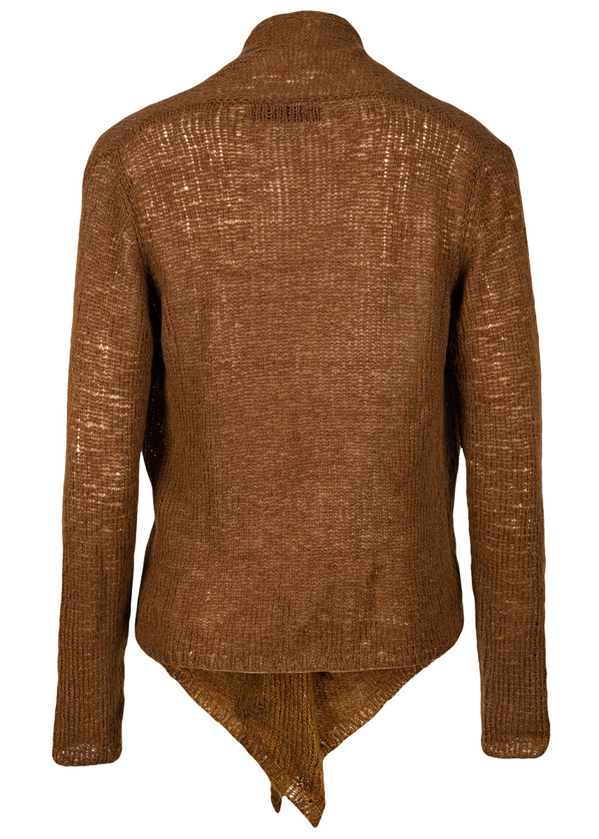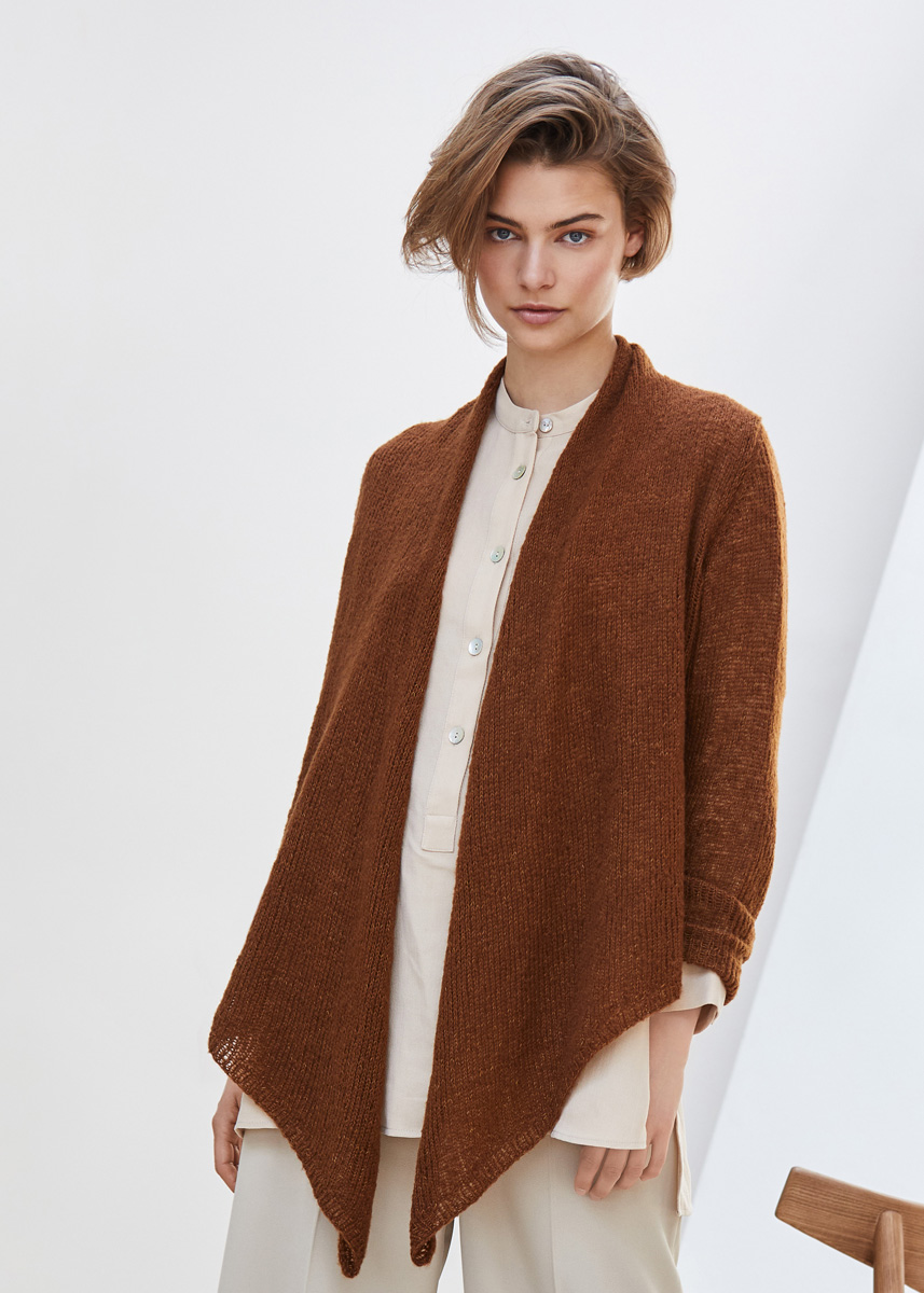 Lana Grossa Cashmere Garzato (48% kashmir, 34% Pima bomull, 18% ren ny ull merino, løpelengde 170 m/25 g), 150 (175 – 200) g brun (farge 2); strikkepinner nr. 4.