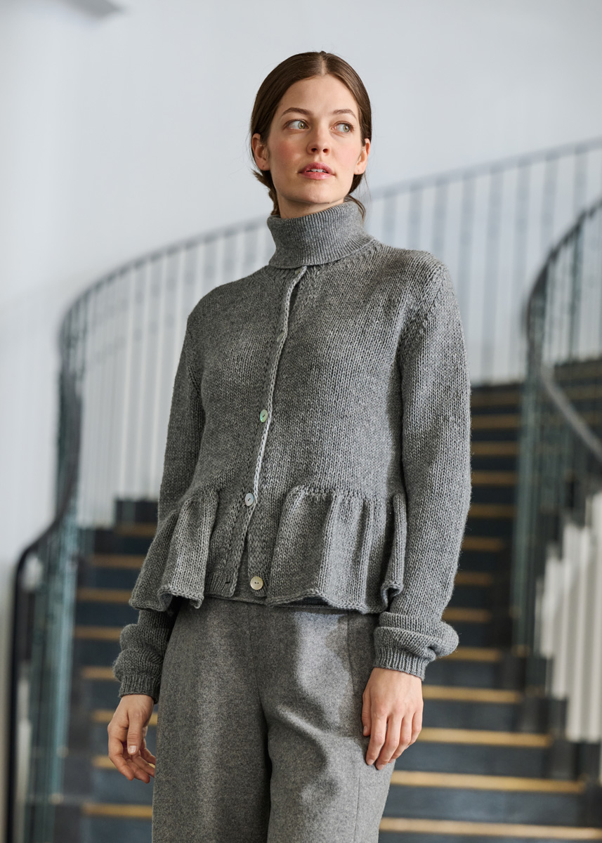 Lana Grossa Cashmere Kiss (70% ren ny ull (merino superfein), 30% kasjmir, løpelengde 70 m/25 g), 475 (525 – 575) g grå meliert (farge 106); strikkepinner nr. 3,5 og 5,5, 1 rundpinne nr. 4,5, 40 cm lang, såvel som 5 knapper fra UNION KNOPF, Art. 37604, farge 12, Ø 18 mm.