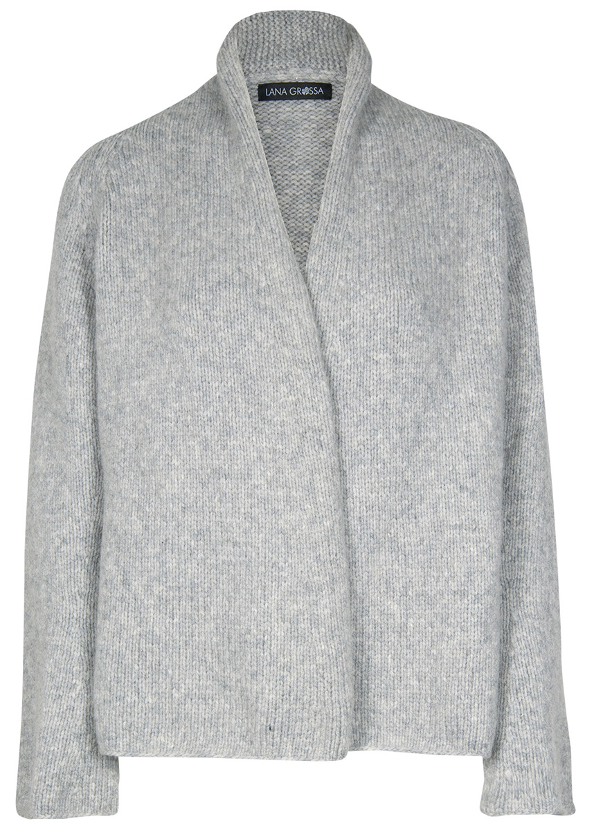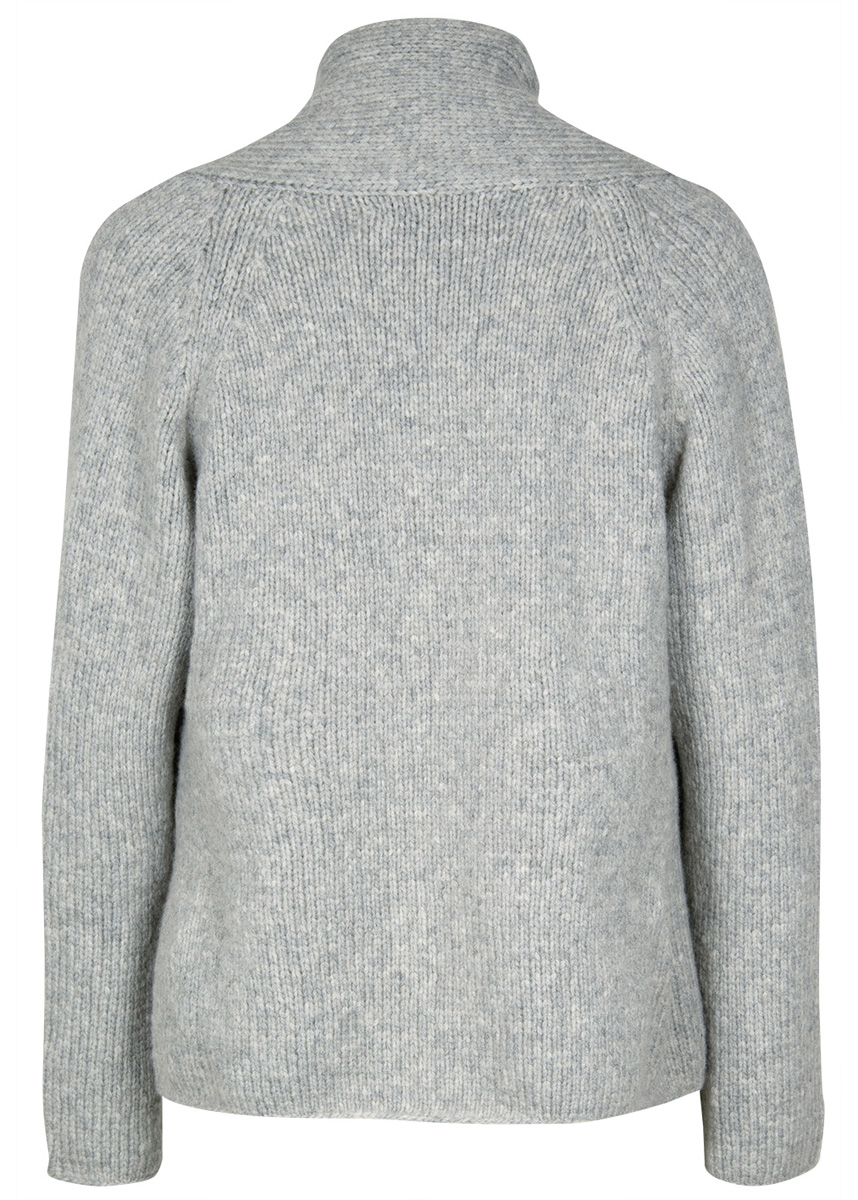 Lana Grossa Cashmere Moda (65% ren ny ull merino, 25% kashmir, 10% polyester, löplängd 90 m/25 g), 375 (400 – 425) g ljus grå (färg 11); stickor nr. 6 och 6,5, 1 virknål nr. 6.