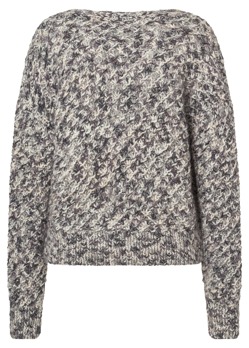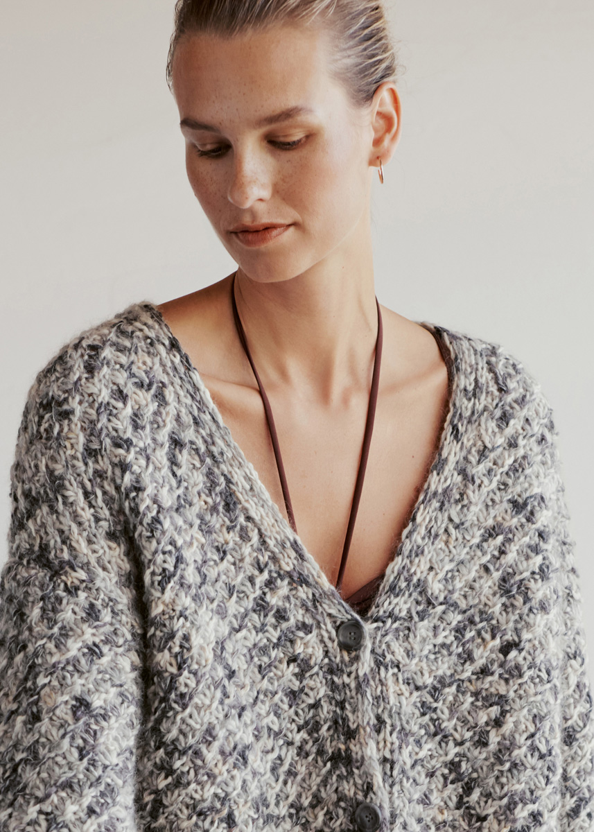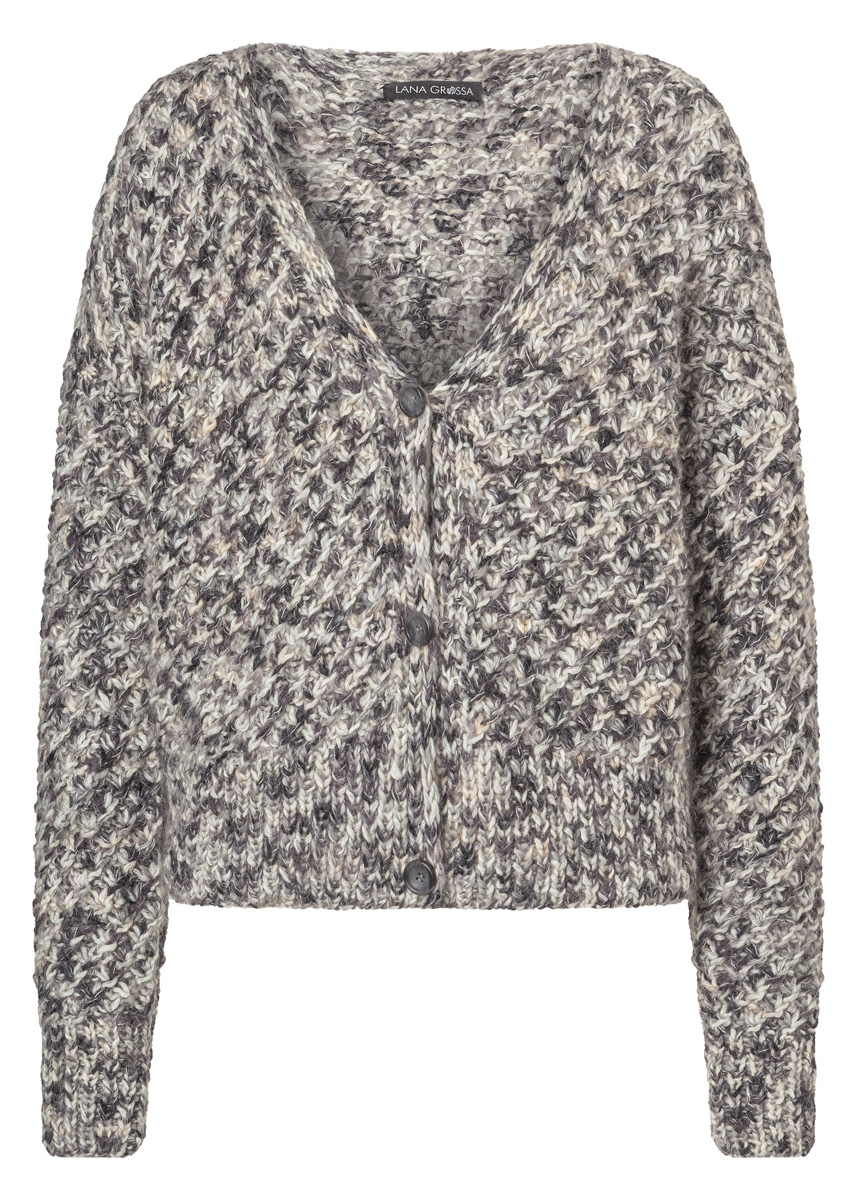 Lana Grossa „Colortwist“ (74% ren ny ull (merino), 20% bomull, 6% polyamid, löplängd 90 m/50 g), 550 (600 – 650) g vit/ljusgrå/mörkgrå (färg 7) och Lana Grossa „Silkhair“ (70% mohair (superkid), 30% silke, löplängd 210 m/25 g), 100 (125 – 150) g gråbeige (färg 184); stickor nr. 6 och 7, samt 3 knappar från Union Knopf, färg grå, Ø 20 mm.