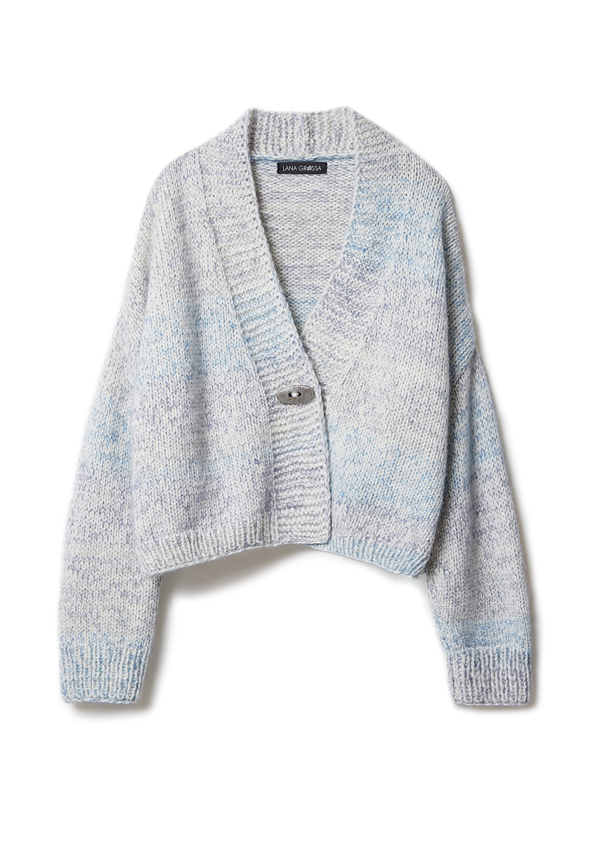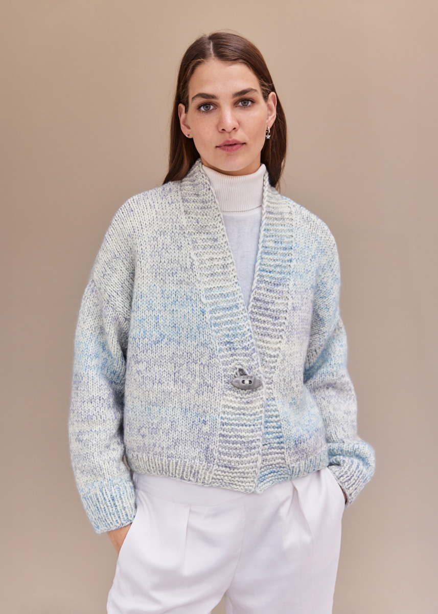 Lana Grossa-kvalitet „Cool Merino Big Color“ (90 % ren ny ull (merino), 10 % polyamid, löplängd = ca 90 m/50 g): ca 500 (550 - 600 - 650 - 700) g råvit (färg 201); Lana Grossa-kvalitet „Silkhair Print“ (70 % mohair (superkid), 30 % silke, löplängd = ca 210 m/25 g): ca 100 (125 - 125 - 150 - 150) g musgrå/ljusgrå/grålila/jeans/gråblå (färg 431); stickor nr. 5,5 och nr. 7; 1 Duffelknapp, storlek 50 mm, Art-Nr: 837244 från Union Knopf. Jackan stickas med dubbla trådar, en tråd av varje kvalitet