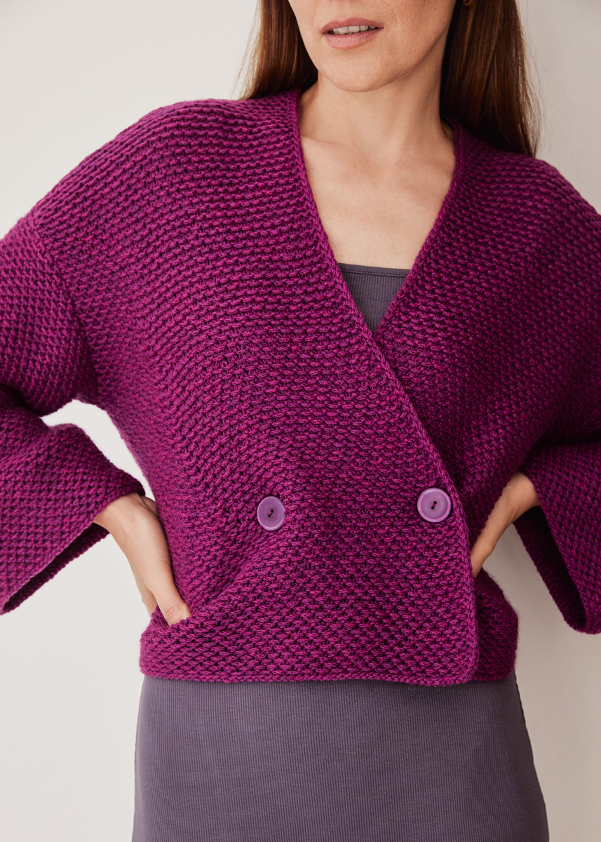 Lana Grossa Cool merino (90% ren ny ull (merino), 10% polyamid, löplängd 150 m/50 g), 450 (500 – 550) g fuchsia (färg 2); stickor nr. 5 och 2 knappar från UNION KNOPF, färg fuchsia, Ø 28 mm