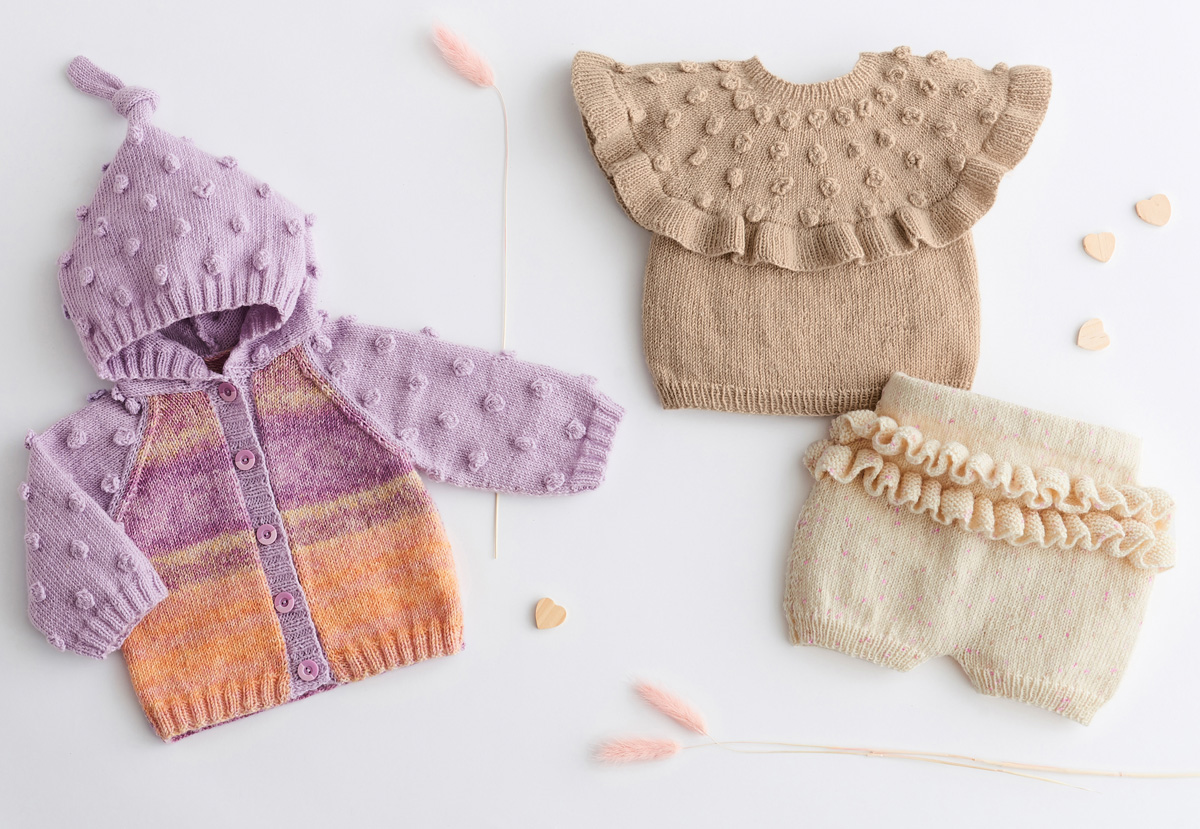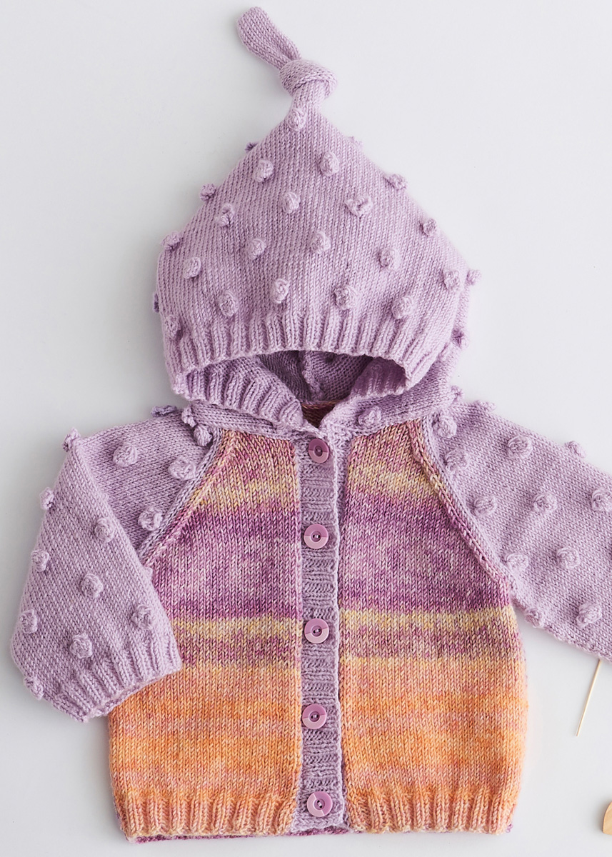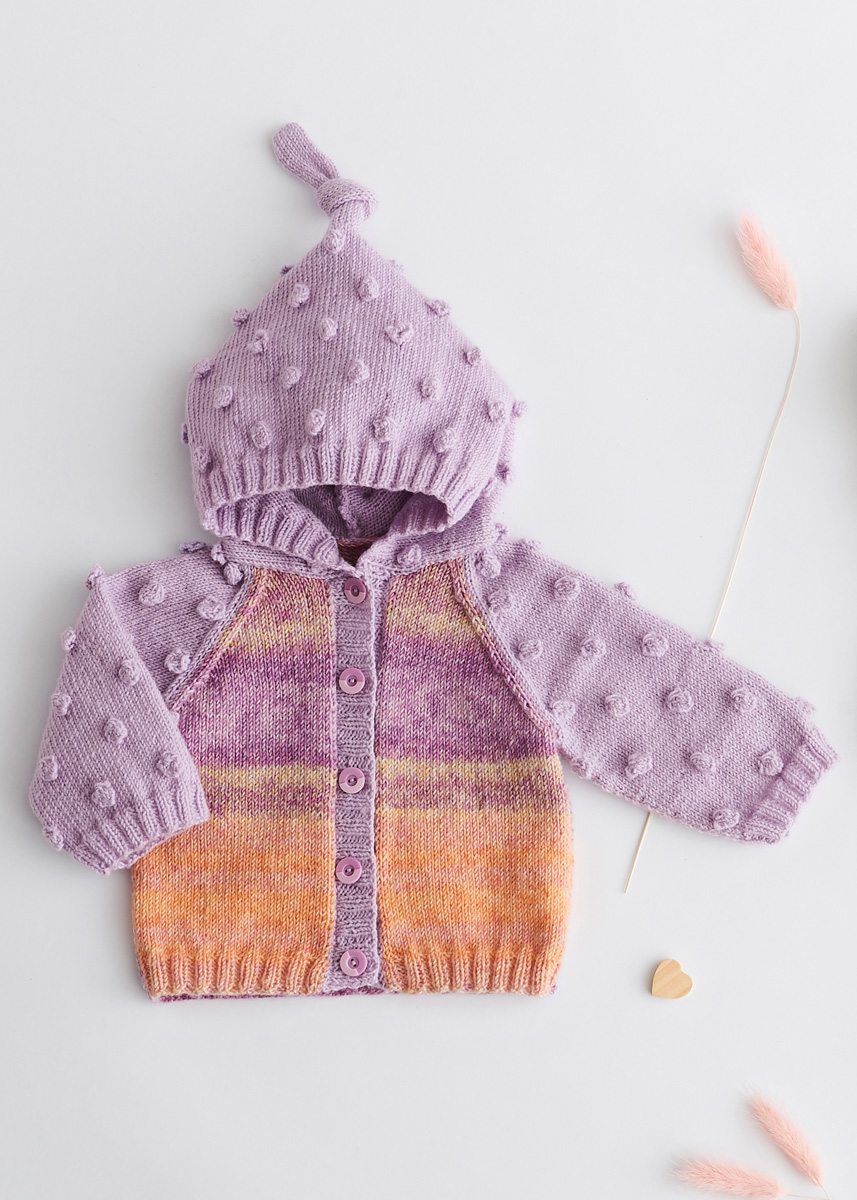 Lana Grossa-kvalitet ”Cool Wool Baby” (100 % ren ny uld, løbelængde = ca. 220 m / 50 gr.): 100(150-150- 150) gr syren (fv 268) og Lana Grossa-kvalitet ”Cool Wool Baby Dégradé” (100 % ren ny uld, løbelængde = ca. 220 m / 50 gr.): 50(100-100-100) gr orange/laks/lysegul/syren/violet (fv 514), strikkepinde nr. 3, 5 knapper 14 mm Ø.
