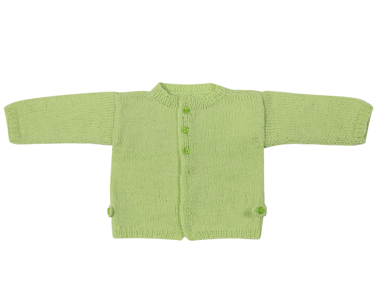 Lana Grossa-kvalitet ”Cool Wool Baby” (100 % ren ny uld, løbelængde = ca. 220 m / 50 gr.): 100(100-150) gr lime (fv 228), strikkepinde nr. 3½, rundpind nr. 3½, 40 cm, 5 knapper 10 mm Ø.
