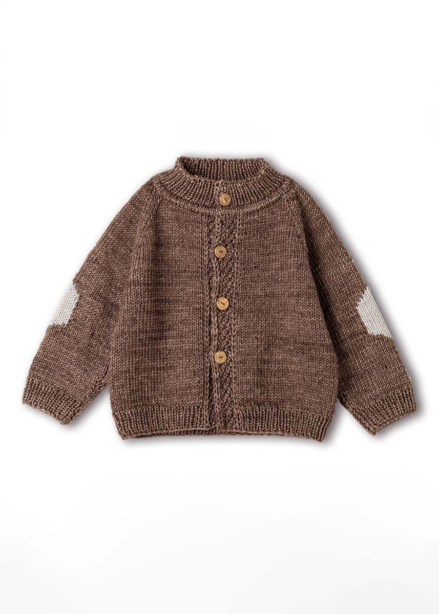 Lana Grossa Cool Wool Big Vintage (100 % ren ny uld (ekstrafin merino), løbelængde = ca. 120 m / 50 gr.): 100 (100 – 150 – 150) gr mørkebrun (fv 7184) og Lana Grossa Cool Wool Big (100 % ren ny uld (ekstrafin merino), løbelængde = ca. 120 m / 50 gr.): 50 (50 – 50 – 50) gr grège (fv 1010), 2 rundpind nr. 3½, strikkepinde nr. 4, maskemarkører (mm), 4 træknapper 15 mm Ø.