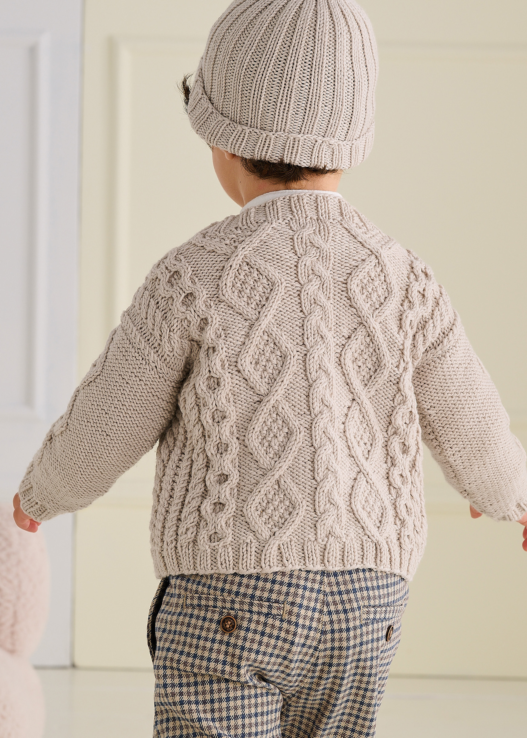 Lana Grossa Cool Wool Big (100% ren ny ull (merino extrafine); løpelengde = 120 m/50 g): 250 g grège (farge 1010); rundpinne nr. og nr. 4; 1 flettpinne; 3 knapper med 20 mm Ø.