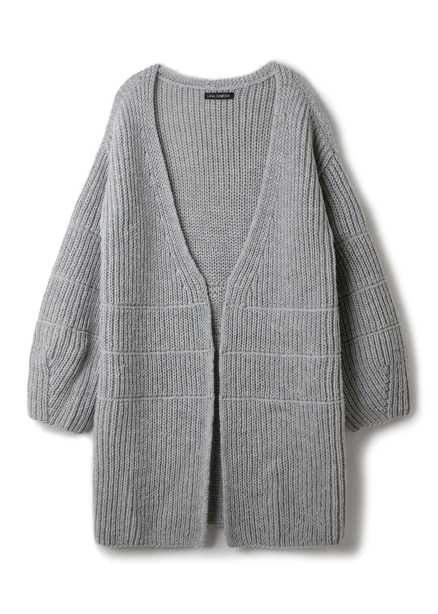 Lana Grossa Cool Wool Big Mélange (100 % ren ny ull (merino), LL = ca. 120 m/50 g), 950 (1000 – 1050 – 1100) g lys grå melert (frg 616) Pinner: Rundpinne nr. 4,5 Tilbehør: 2 maskemarkører (MM)